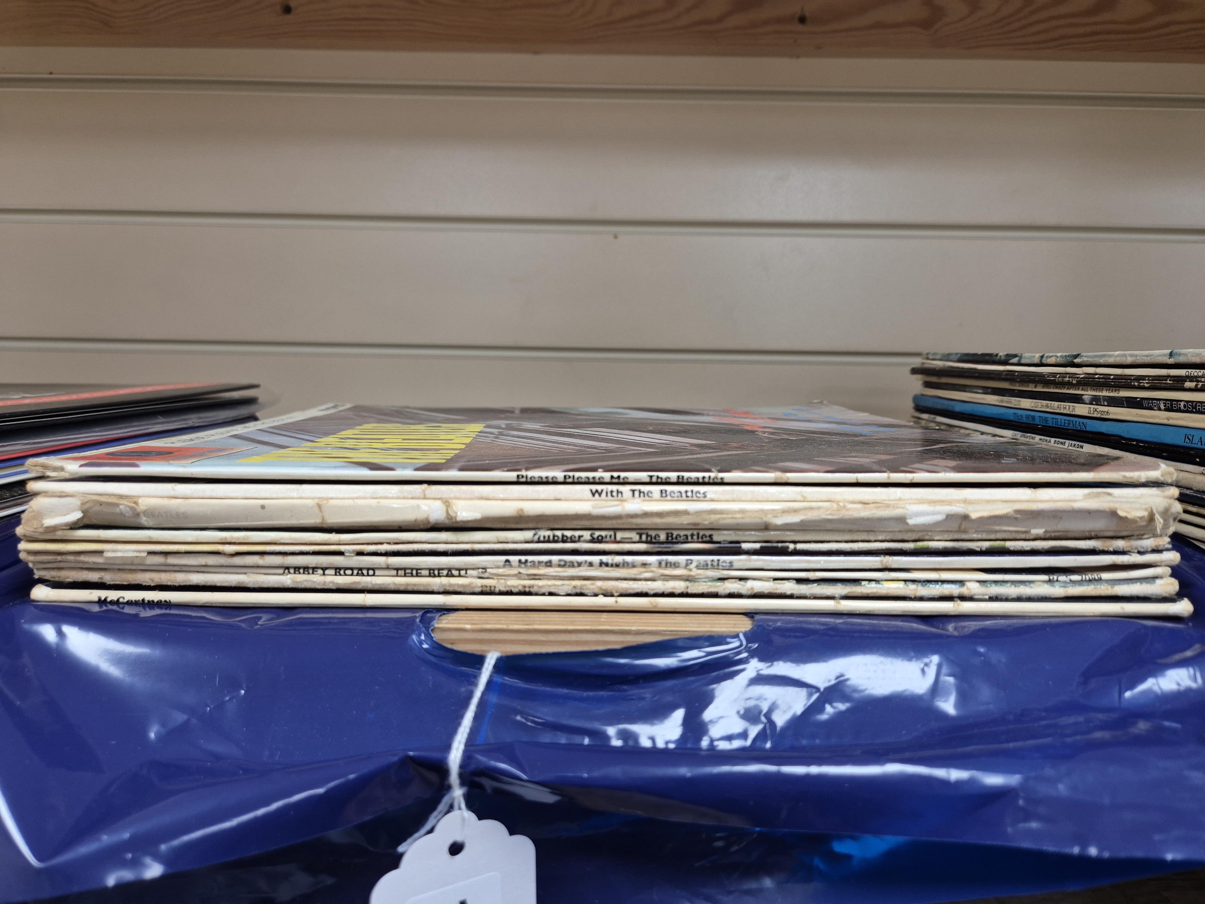 Nine The Beatles and related LP record albums, including; the ‘White Album’ with top loading cover No.0190027, With The Beatles, Please Please Me, Rubber Soul, Beatles For Sale, A Hard Days Night, Abbey Road, Sgt. Peppers, and McCartney