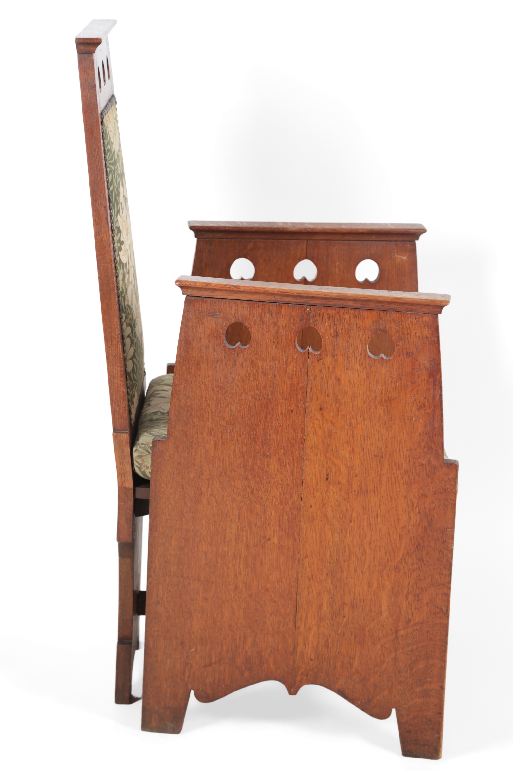 the pylon-shaped boarded back support pierced with three heart-shaped motifs to the cresting above a brass studded fabric panel, the boarded seat flanked by a pair of boarded arm supports, each pierced with three heart shaped motifs, joined by a T-shaped stretcher, ivorine label beneath stretcher ‘Trapnell & Gane, 38-40 College Green, Bristol’, the loose cushion and back panel with Morris and Co. style fabric, 100cm high x 57cm wide x 60cm deep