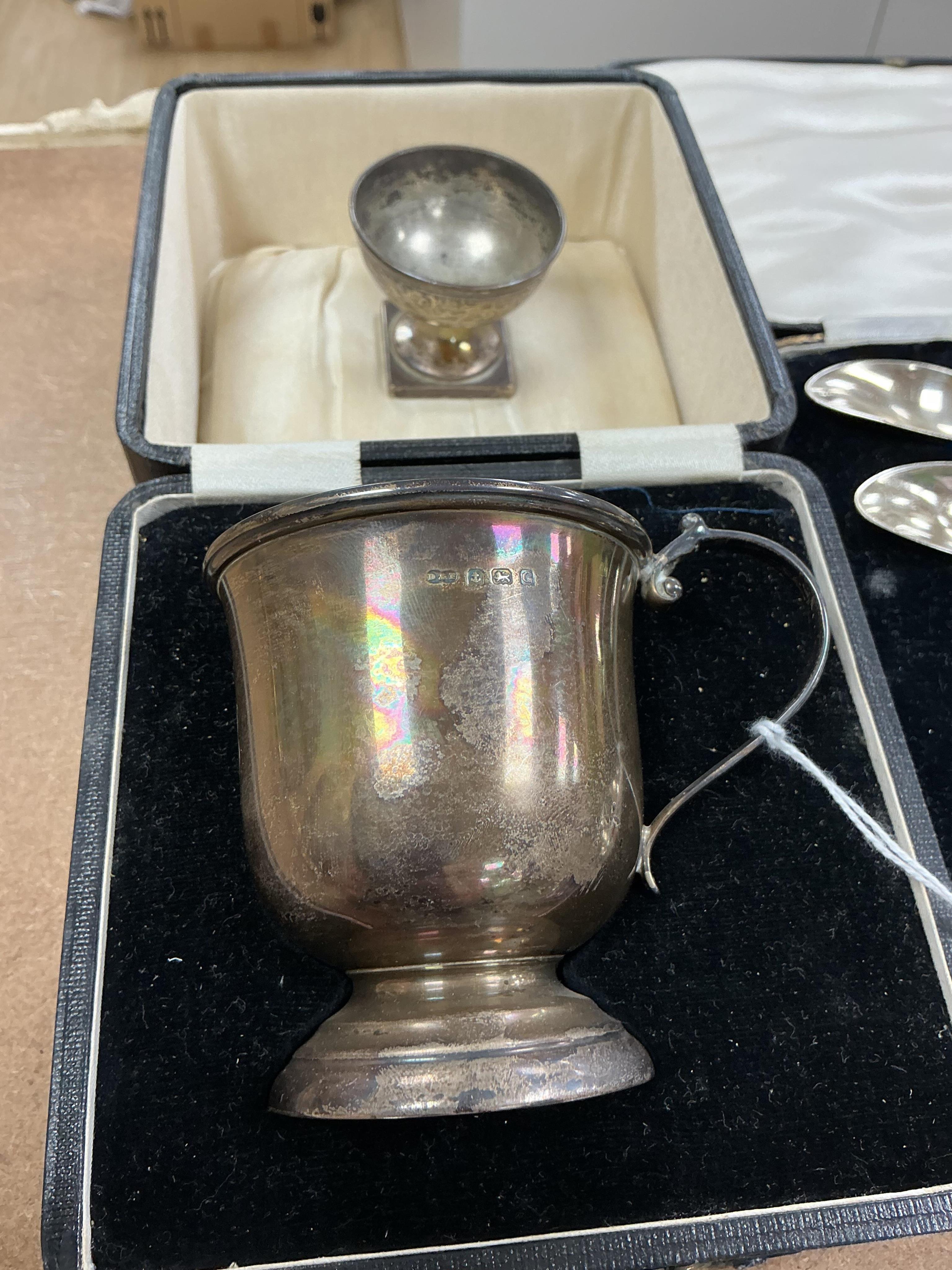 A cased George V silver christening mug by Deakin & Francis, Birmingham, 1931, a pair of late Victorian silver pedestal salts, six silver grapefruits spoons and a cased set of silver handled tea knives and a quantity of other sundry small flatware etc.