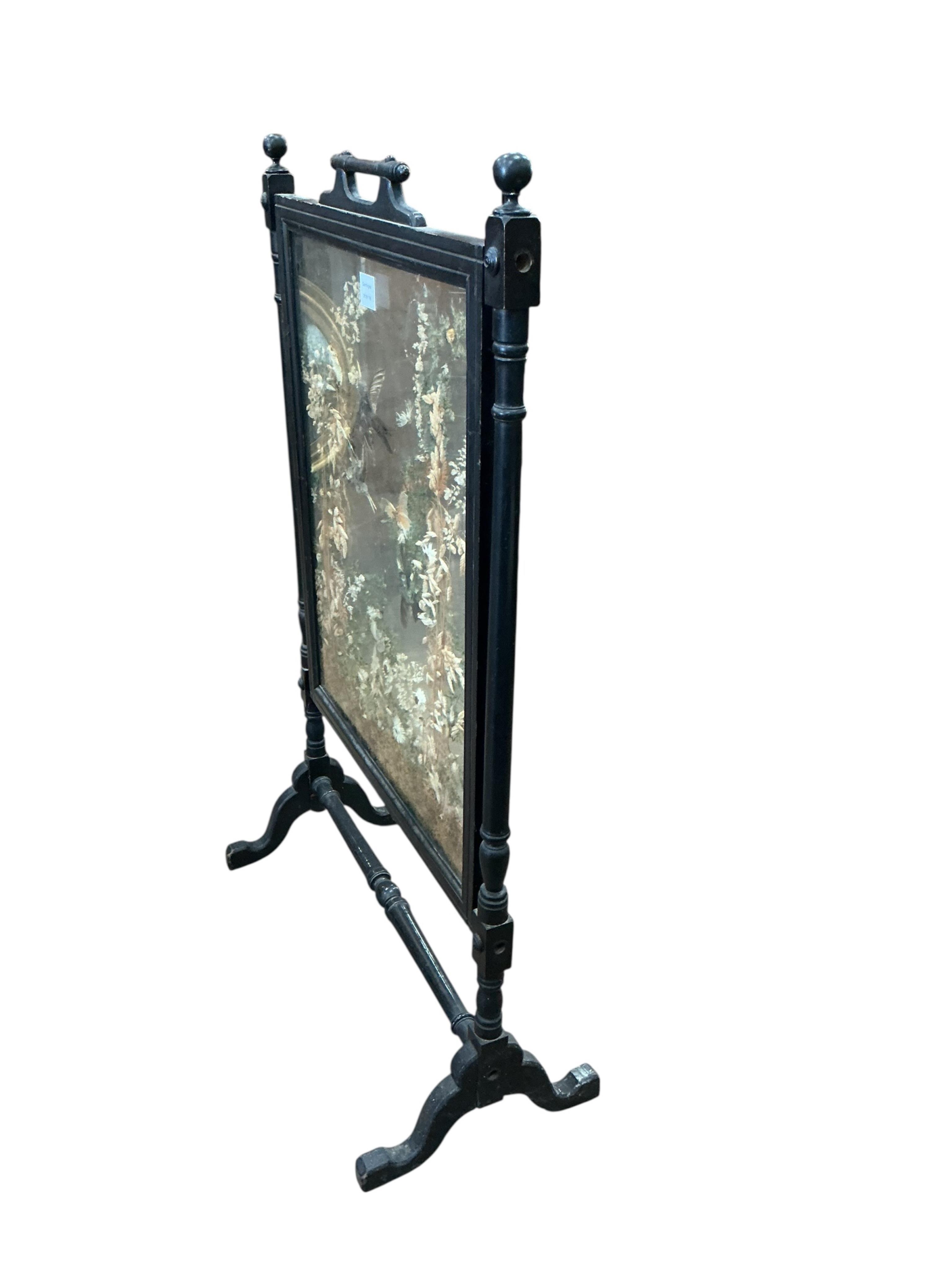 Lot 1098 , A late Victorian ebonised framed fire screen, the double sided glazed panel filled with humming birds, flowers and foliage, width 64cm, depth 30cm, height 103cm