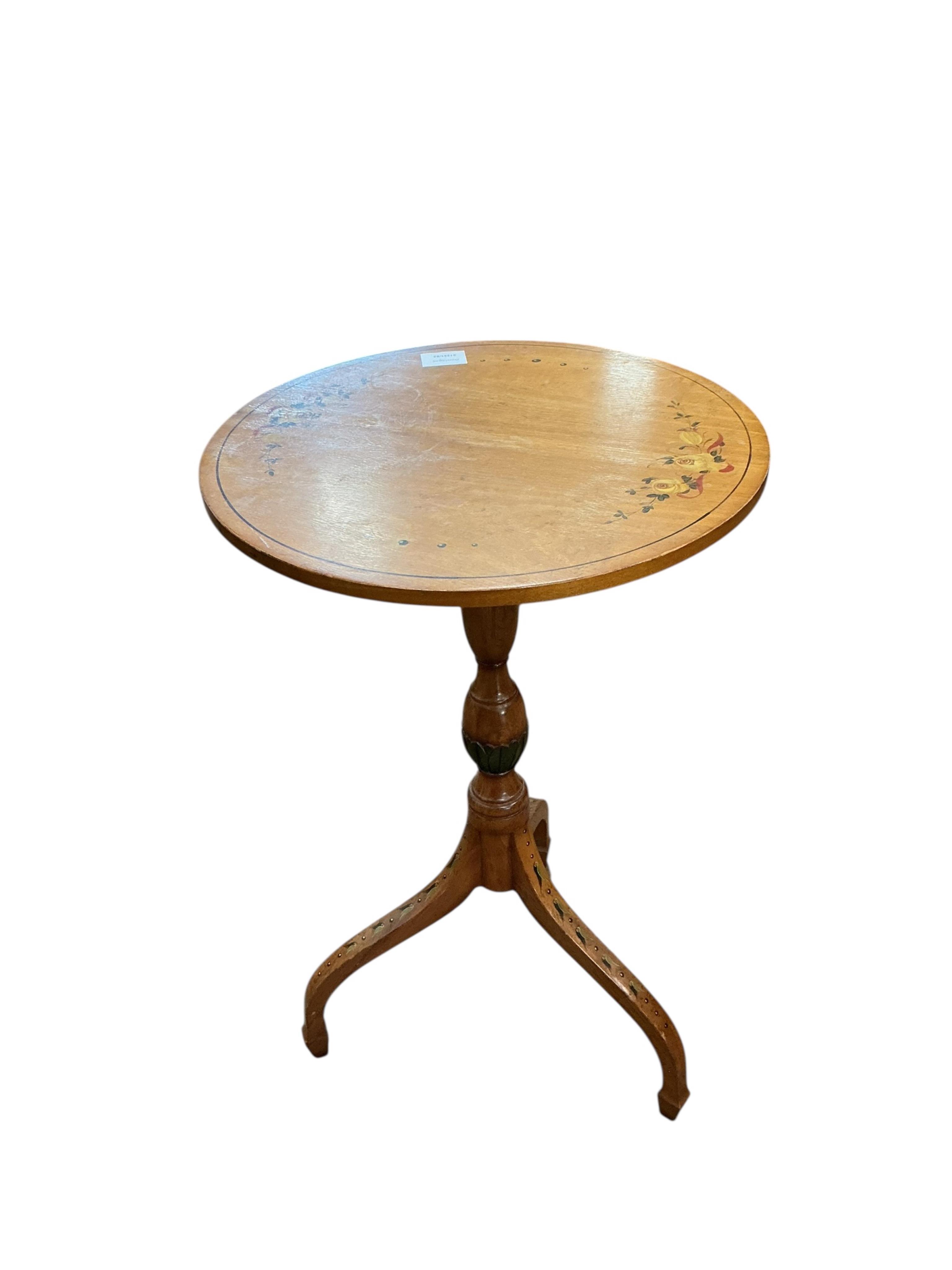 Lot 1093 , A Sheraton style floral painted and decorated circular topped wine table, on a carved pillar and inverted splayed tripod base, diameter 43cm, height 70cm