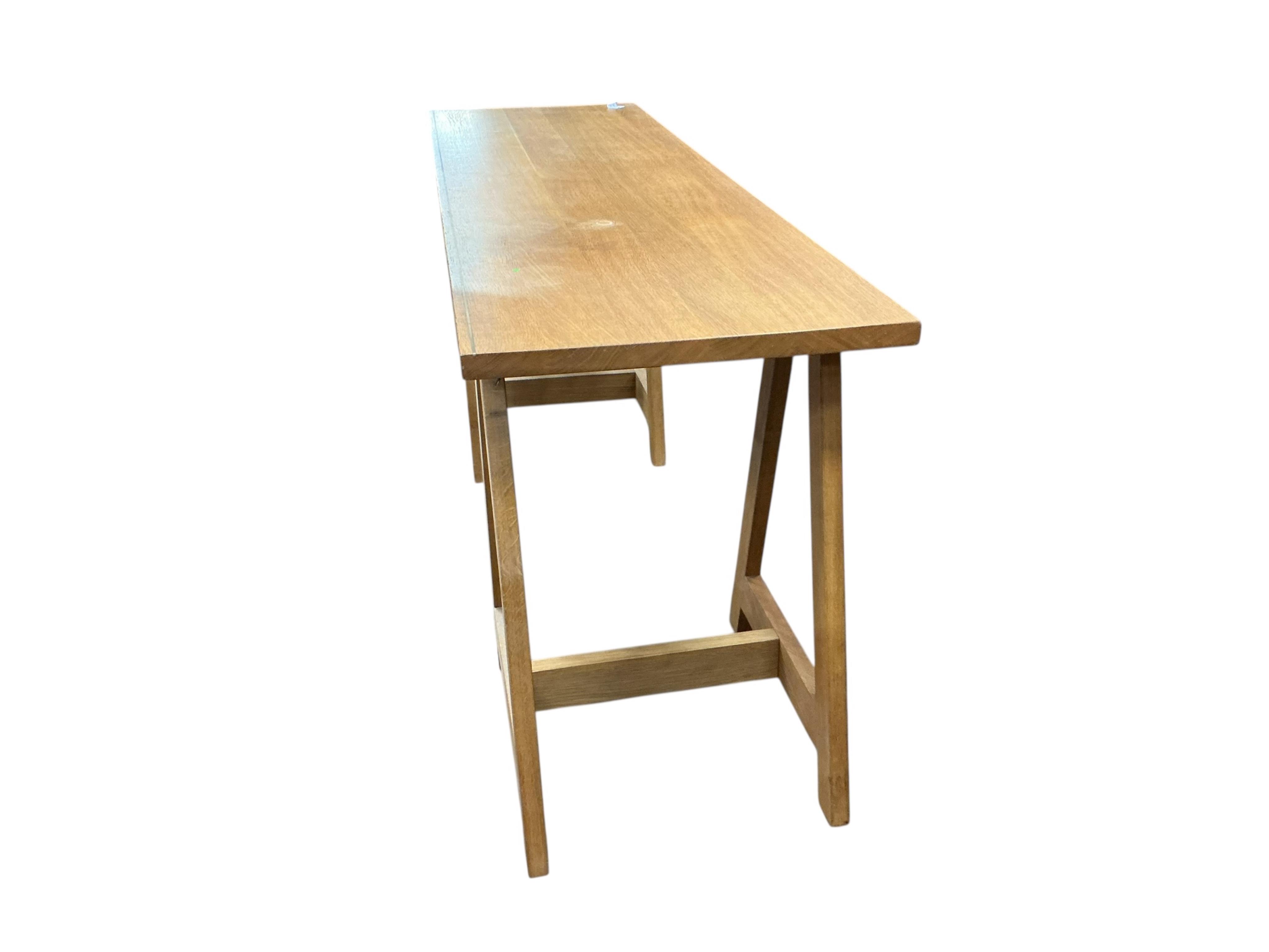 A mid century oak trestle desk, width 165cm, depth 50cm, height 74cm