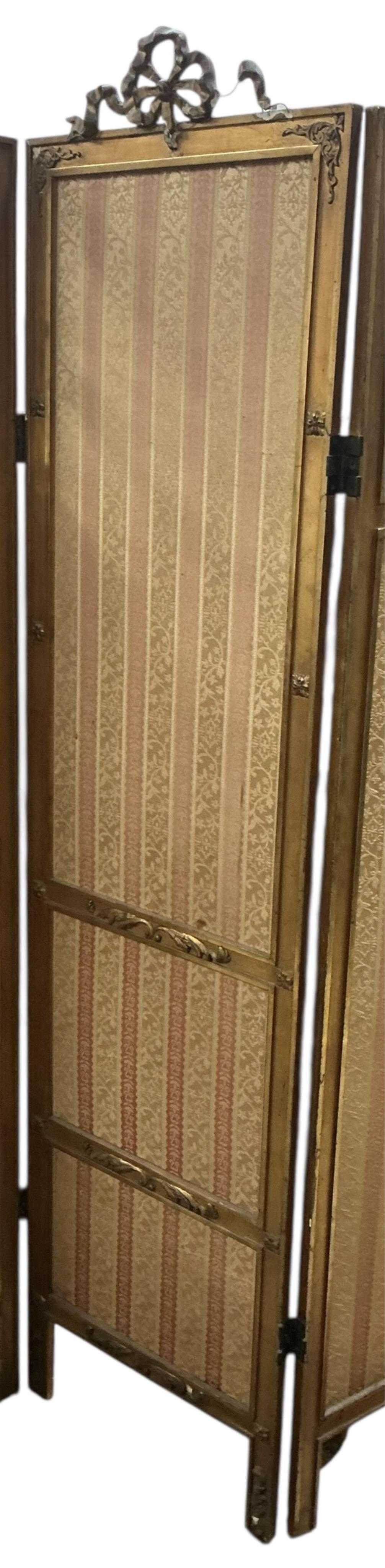 A late 19th century glazed giltwood three fold dressing screen, each panel width 45cm, height 184cm