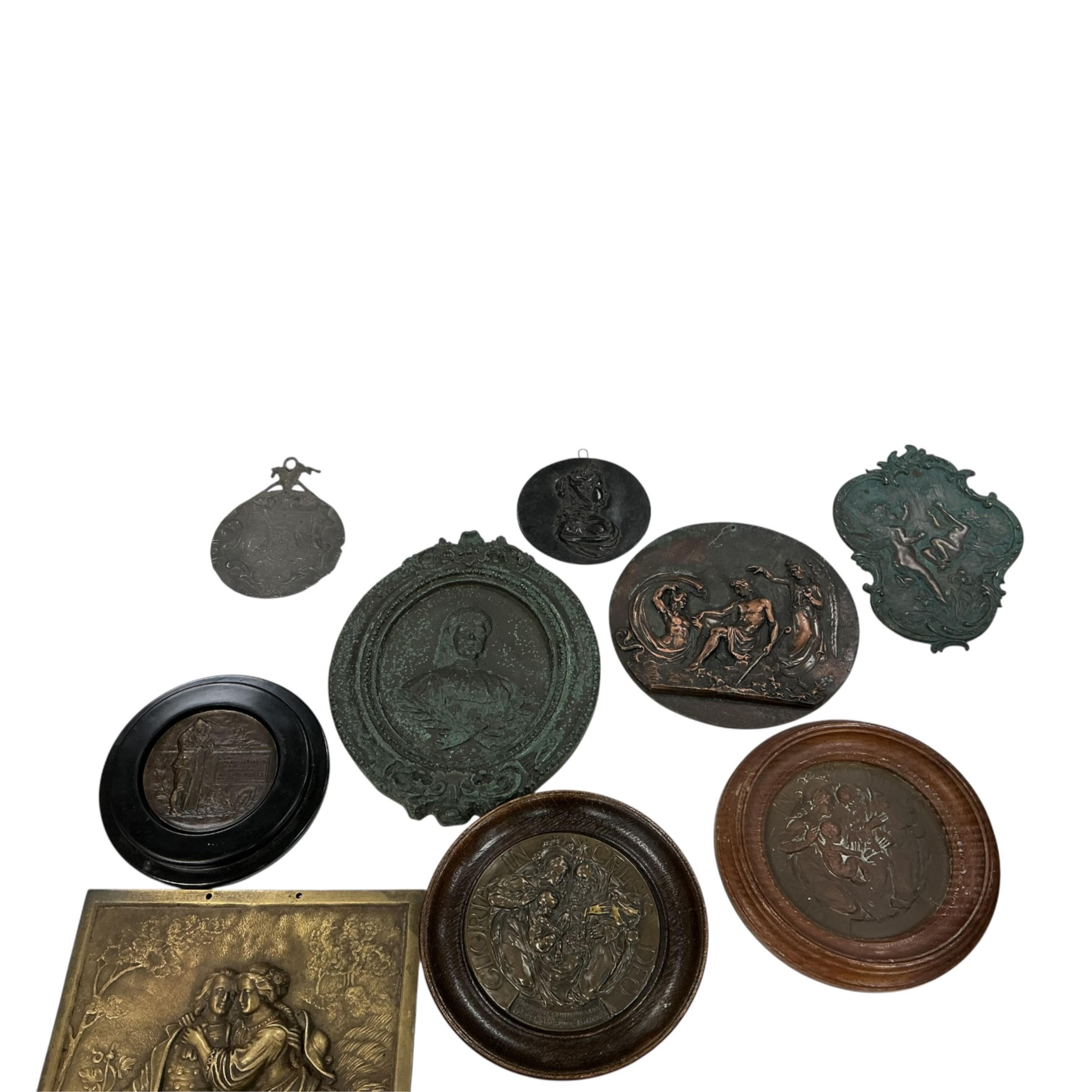 Lot 1341 , A group of bronze and metal plaques and Uniface Medals, 19th/20th century, largest 25 x 18cm, and a ‘Billy and Charley’ pilgrim badge forgery (11)