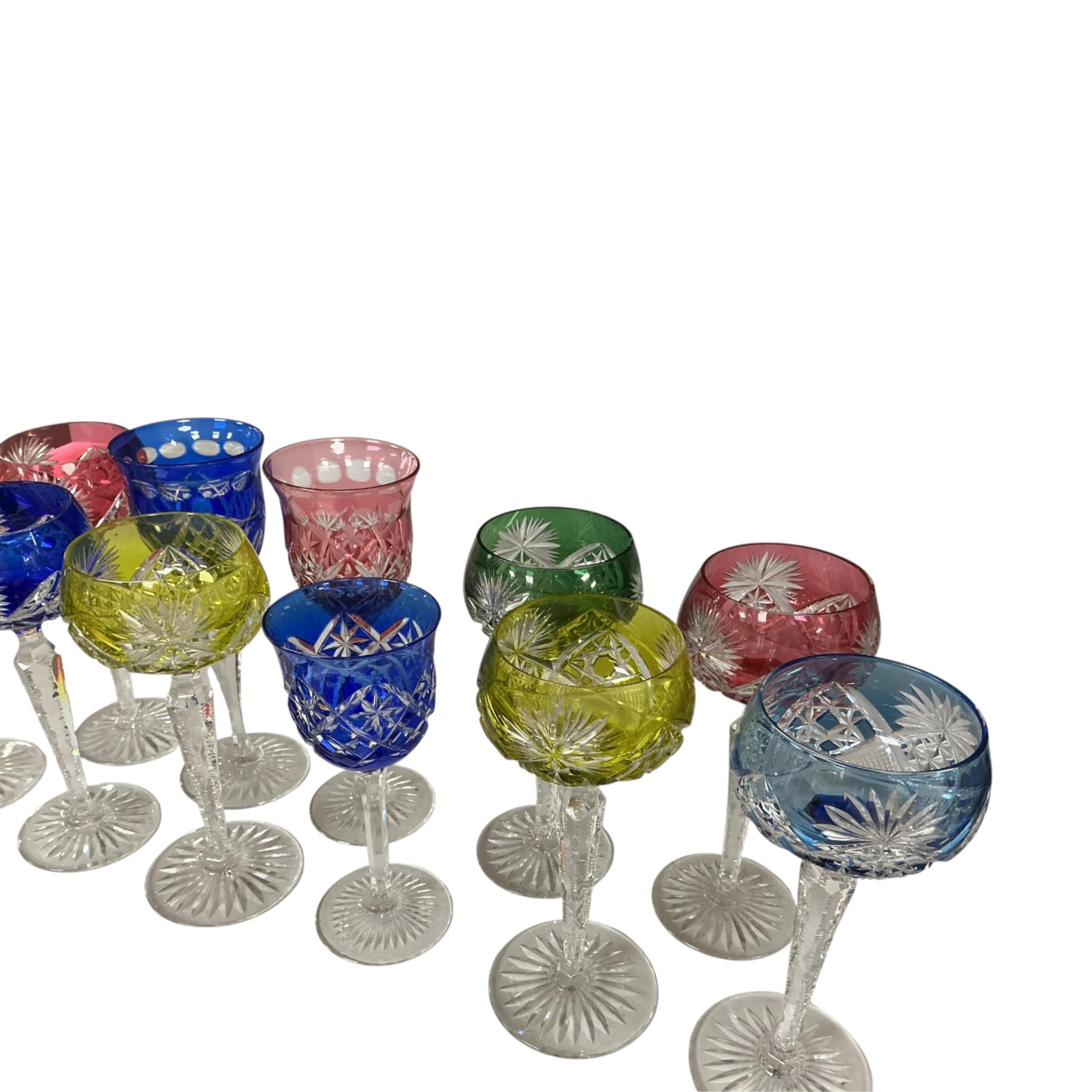Lot 1328 , A harlequin set of eight colour flashed cut glass hock glasses and three others, tallest 21cm.
