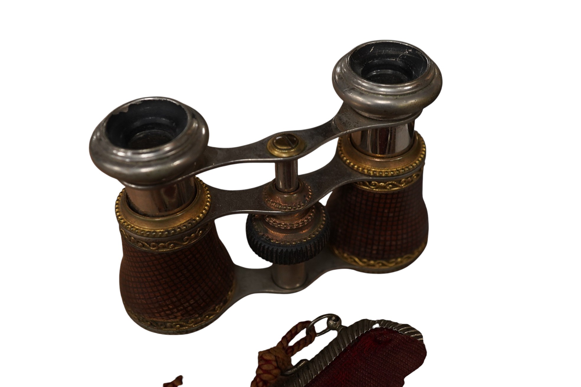 Lot 1416 , A late 19th century French silver plated stamp box width 9cm, a pair of gilt tooled leather mounted opera glasses, mesh purse, lorgnette and Victorian mourning locket