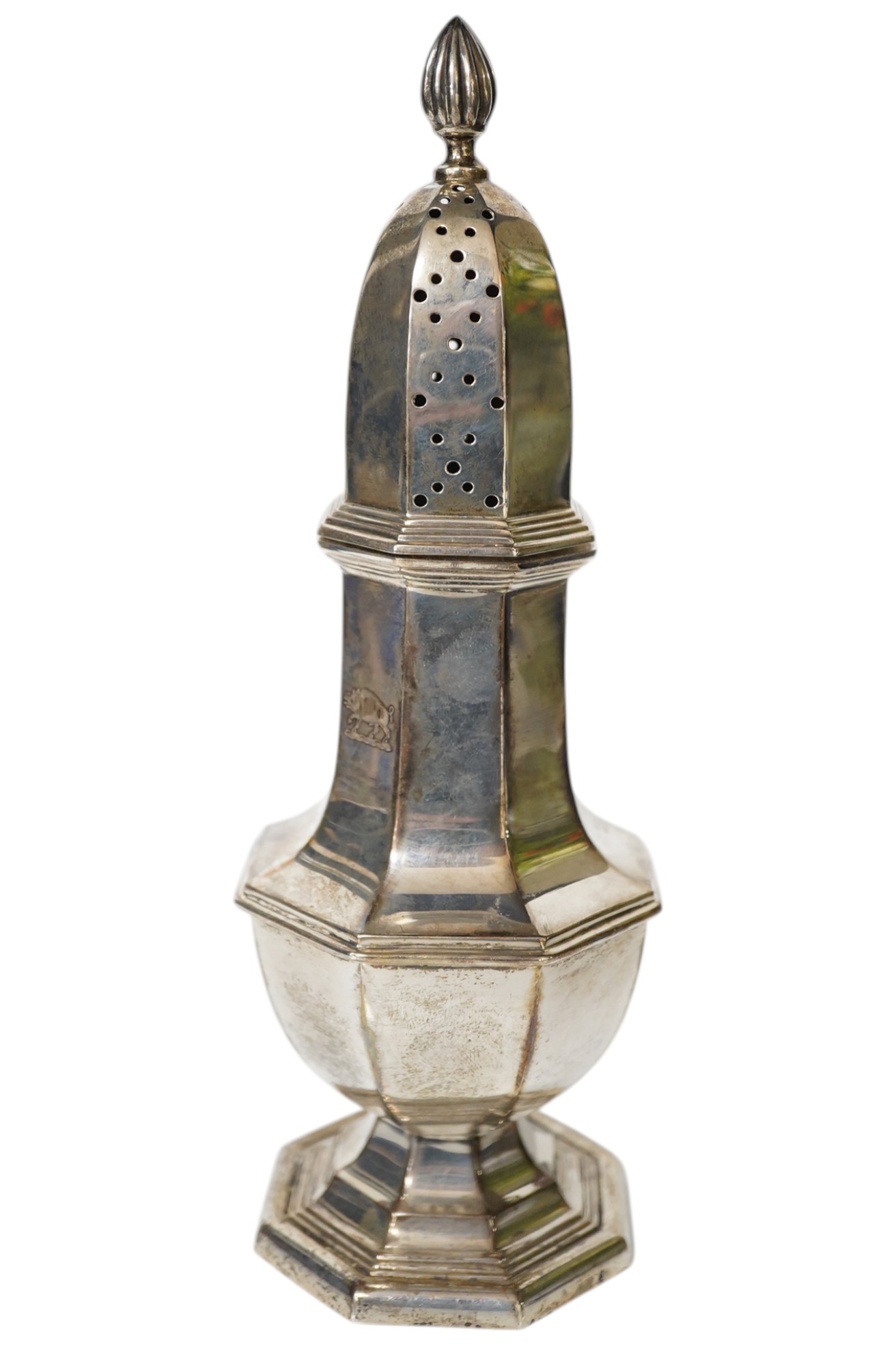 Lot 3862 , An Edwardian silver boat shaped sugar basket, with blue glass liner, by Thomas Bradbury & Sons, London 1907, length 15cm, together with an Edwardian silver octagonal sugar caster.