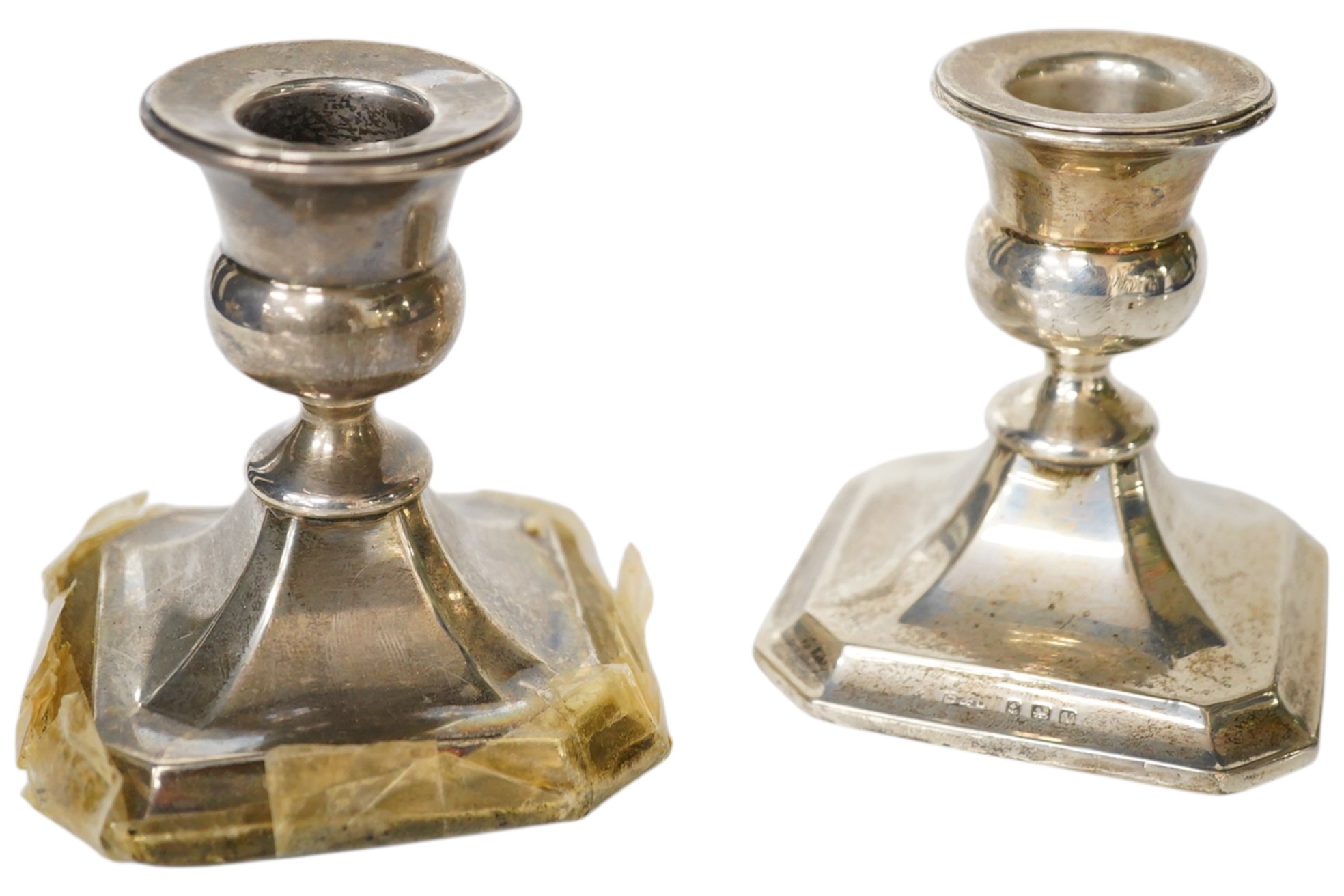 Two pairs of early 20th century silver mounted dwarf candlesticks, tallest by George Unite, 1907, Birmingham, 11.1cm.