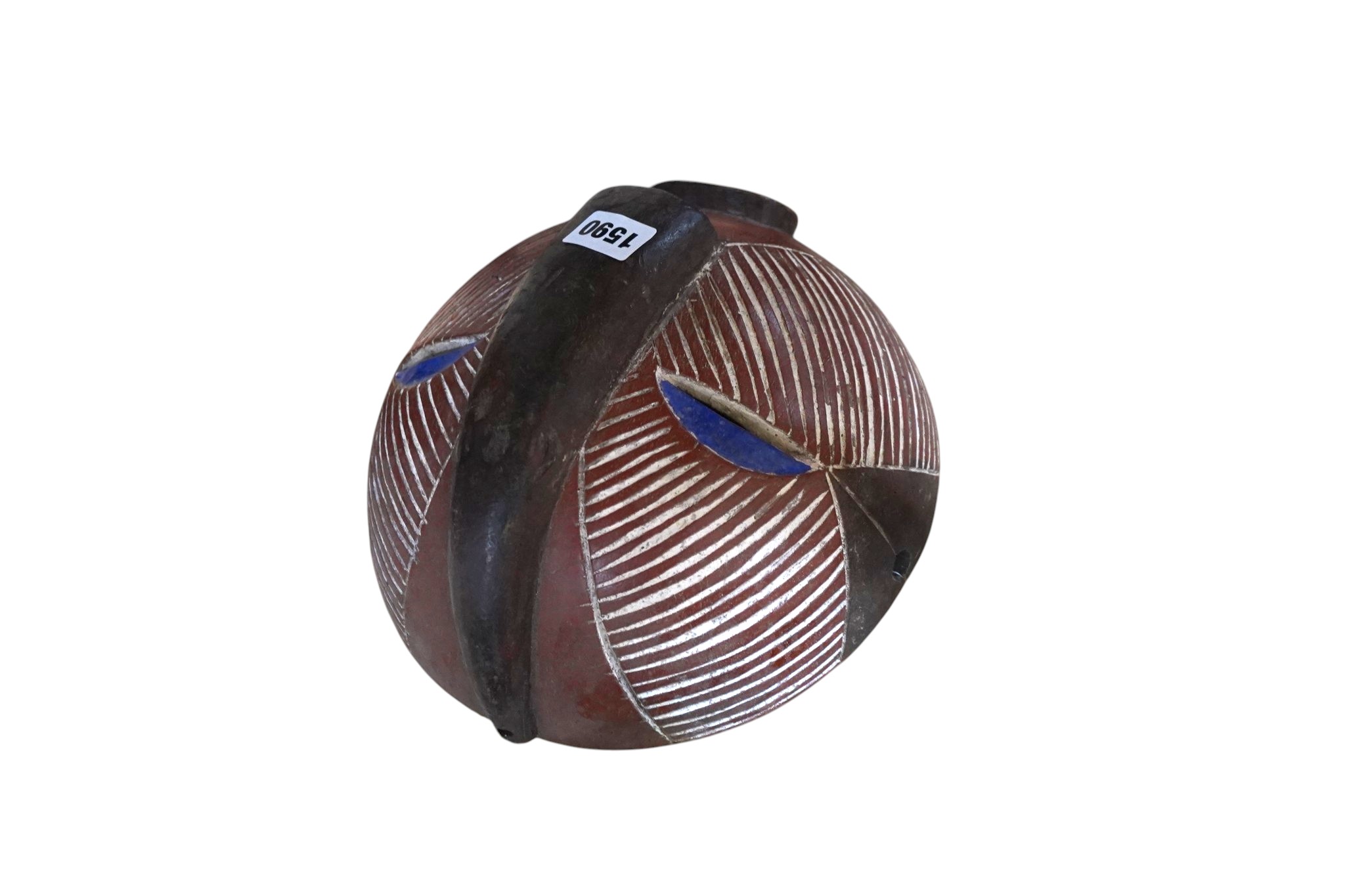 Lot 3590 , Four West African painted, carved masks, spear and stylised antelope carving height 99cm.