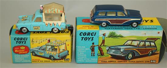 A Corgi 440 Ford Consol Cortina Super estate car, a Corgi 474 musical Walls Ice Cream van, a Corgi 247 Mercedes Benz 600 Pullman, a Corgi 236 Austin A60 deluxe saloon and a Corgi 251 Hillman Imp, (5 items all boxed)