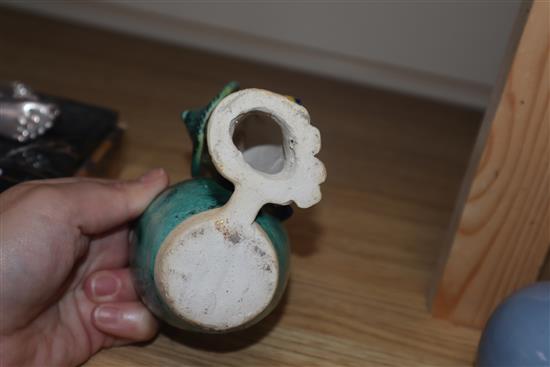 Lot 5 , A Chinese blue glazed bottle vase, Kangxi mark but Republic period and a Chinese pottery figure tallest 12cm