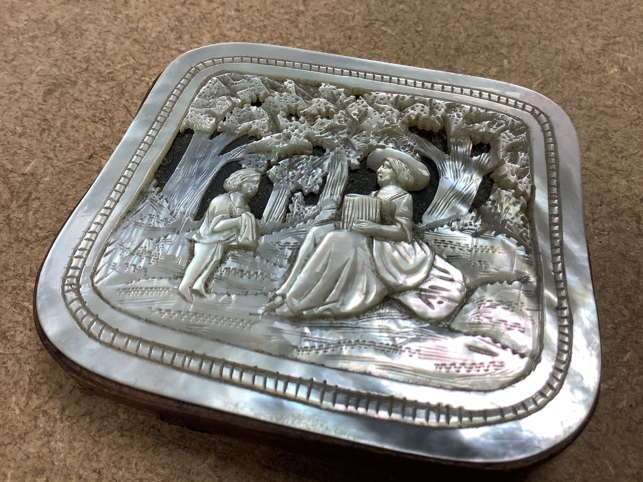 A 19th century carved mother of pearl purse, 6 x 7cm