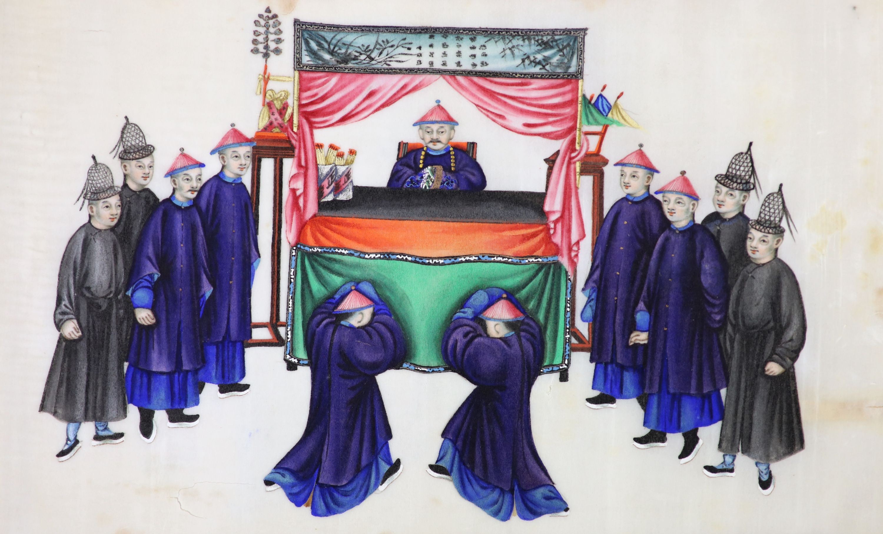 depicting farming scenes, court life and punishment within red ribbon borders, the album with red silk brocade covers,