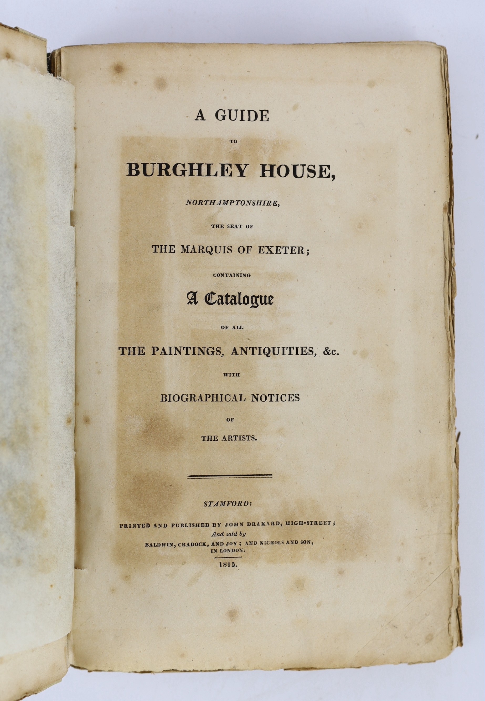 ° LINCS: Blore, Thomas - An Account of the Public Schools, Hospitals, and other Charitable Foundations, in the Borough of Stanford (sic) ... frontis and text engravings; old half calf and marbled boards, gilt-decorated and panelled spine with red label, marbled e/ps. Stamford, 1813; A Guide to Burghley House ... the seat of the Marquis of Exeter; containing a Catalogue of all the paintings, Antiquities, &c. ... 2 plates and d-page pedigree; original printed boards (rebacked), uncut. Stamford, 1815: The Survey and Antiquity of the Towns of Stamford ... and Tottenham-High-Cross ... together with the Turnament of Tottenham ... general title (as given) and the 3 part titles: Stamford (1717, by Richard Butcher); Tottenham (1718, by Wilhelm Bedwell); The Turnament (1718, by Wilhelm Bedwell): old blind-panelled calf (rebacked). printed for W. Meares,1717 (3)