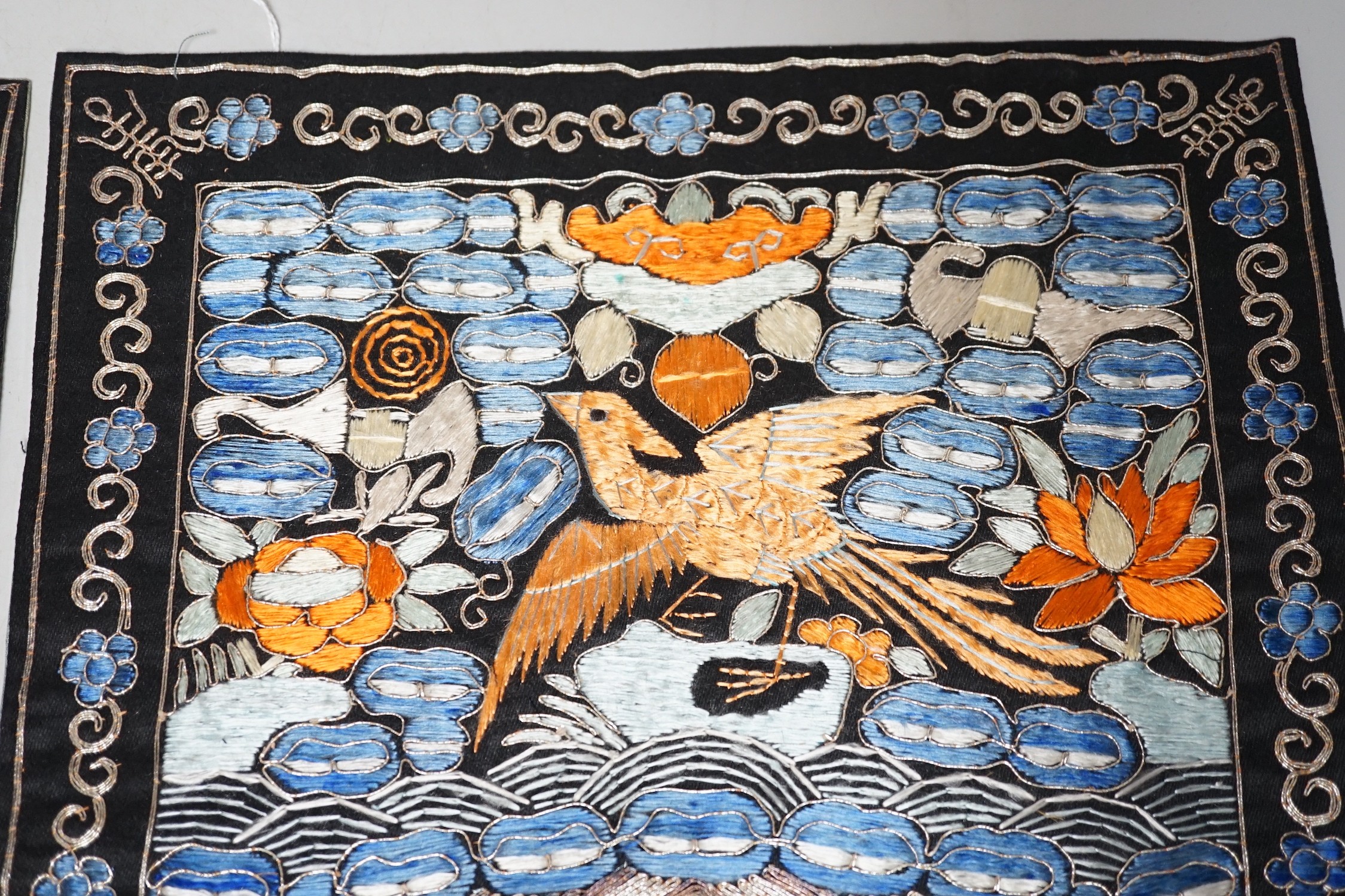 Two Chinese 20th century Chinese rank badges, embroidered I’m metal and coloured silk threads on a black ground, with a central Phoenix surrounded by auspicious symbols, 27cms x 25cms