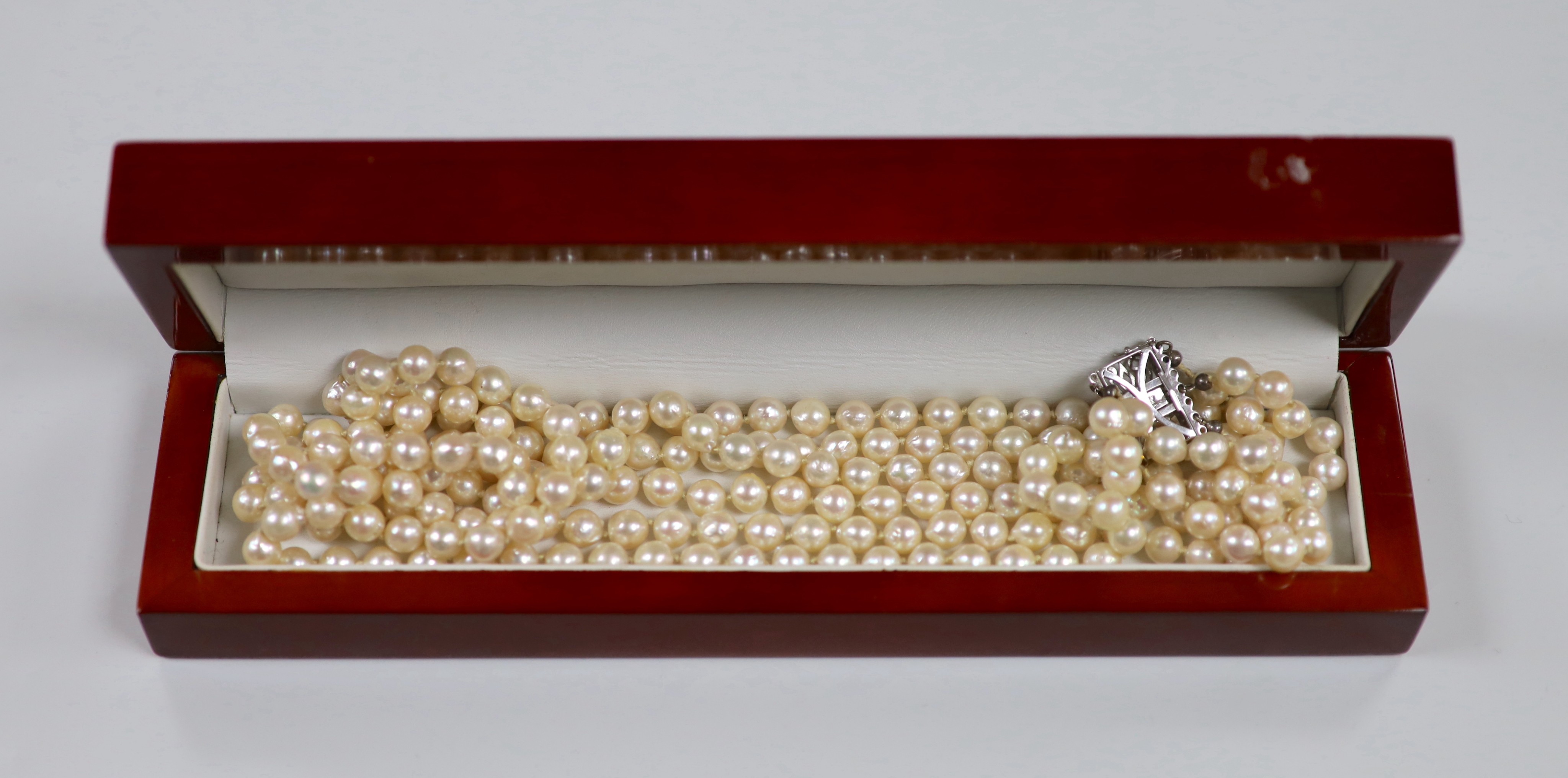Lot 1892 , A mid to late 20th century triple strand cultured pearl necklace, with pierced 750 white metal and five stone emerald chip set clasp, approximately 56cm.