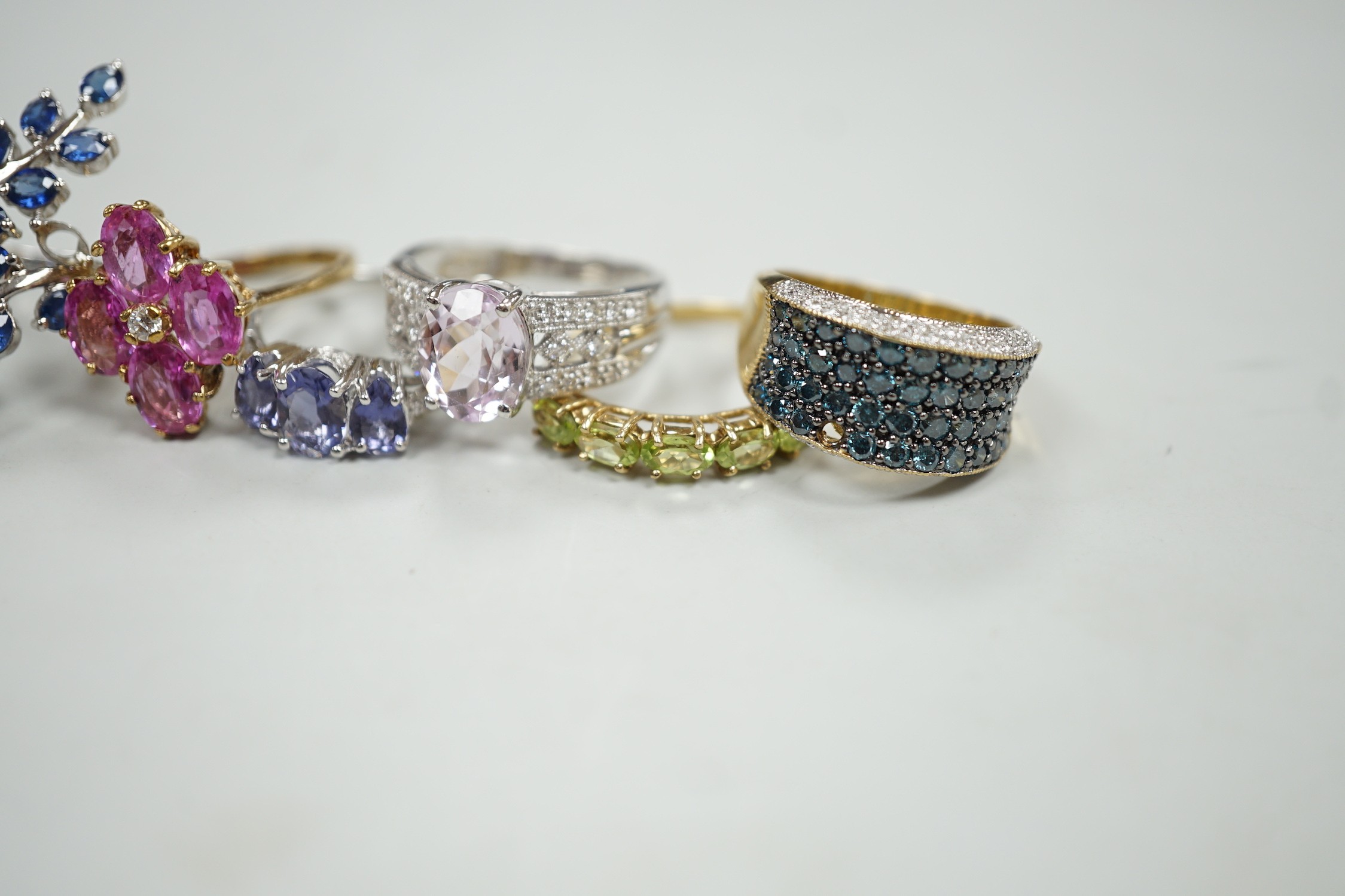 Six assorted modern 9ct gold and gem set dress rings, including three white gold, gross weight 20 grams.