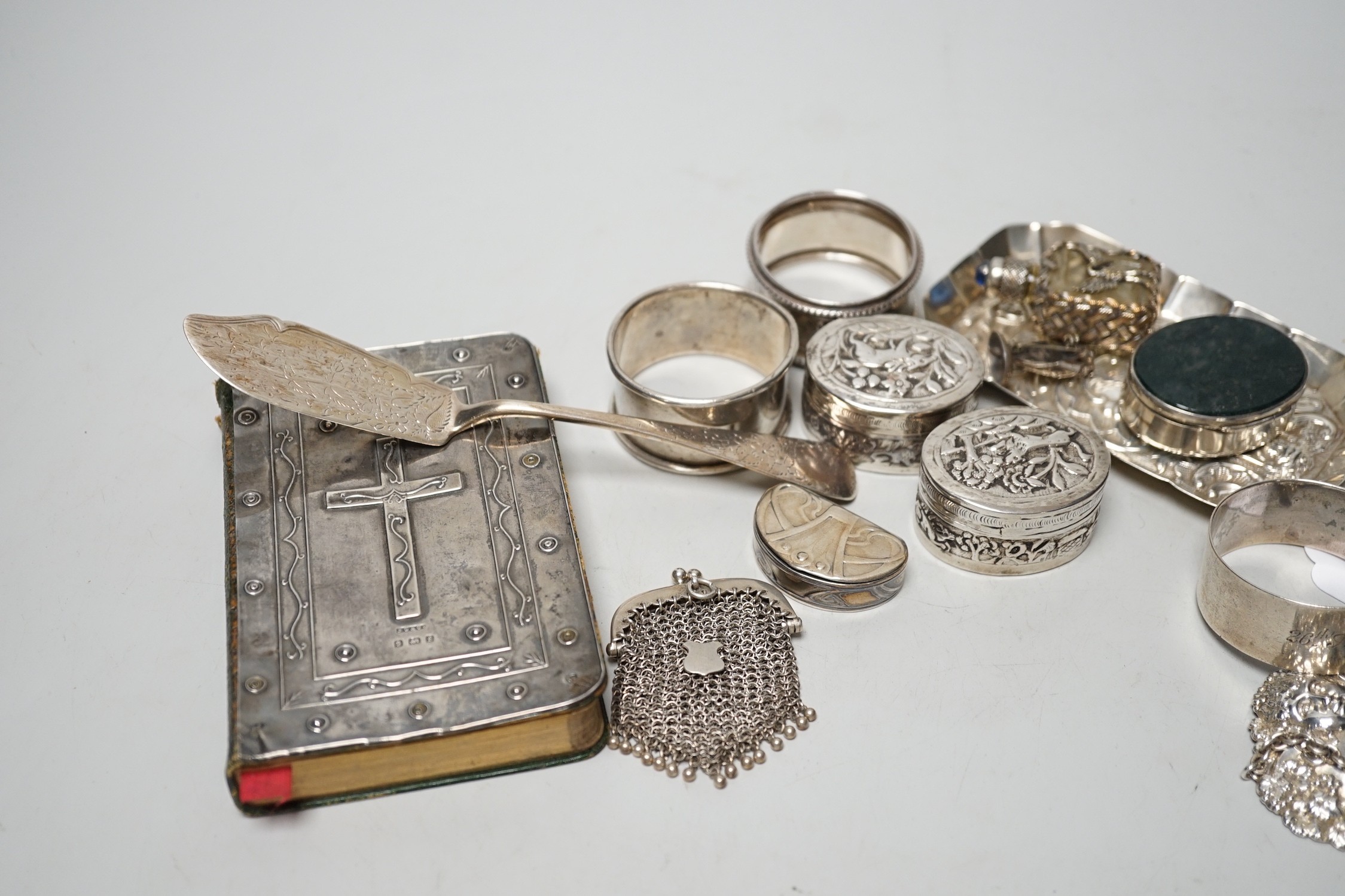 Sundry small silver including four assorted napkin rings, mounted bible, butter knife, pin tray, wine label etc. together with two white metal oval pill boxes, a moss agate mounted oval pill box and scent bottle.