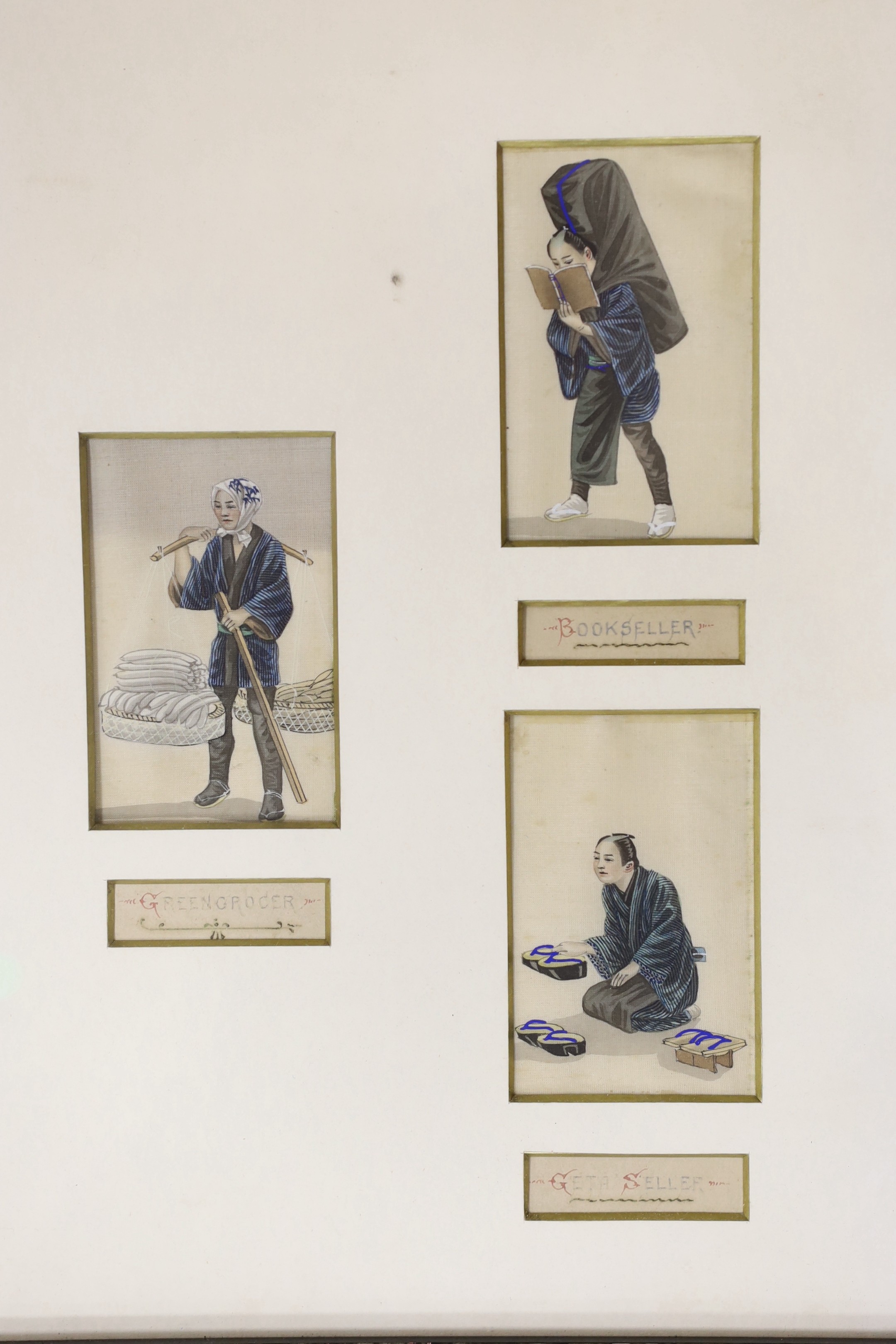 Lot 1681 , 19th century Chinese School, ten gouaches on fabric, Street sellers, each with English titles, 8.5 x 5cm, framed as one