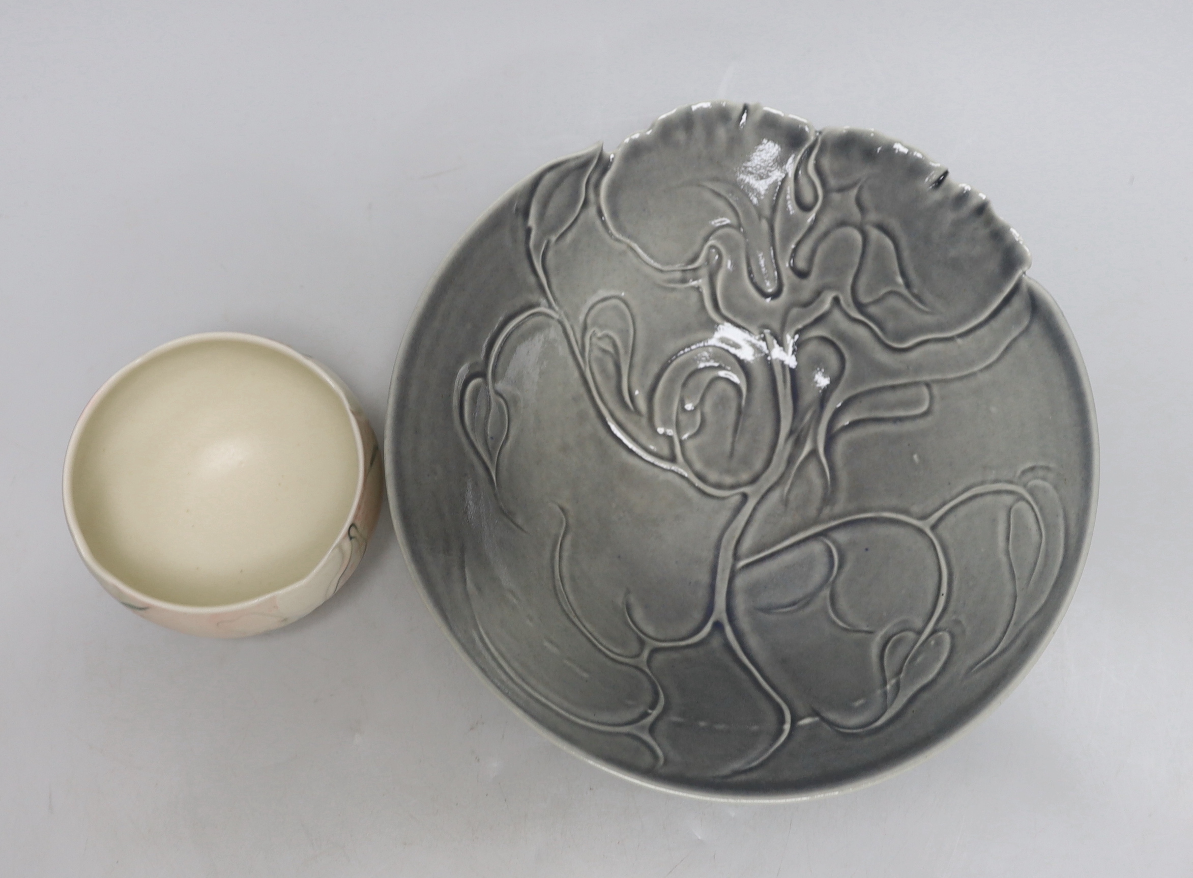 Three hand thrown and carved stoneware pieces by one maker purchased at Water Perry, Oxford, each signed to the base, the largest 23cm in diameter
