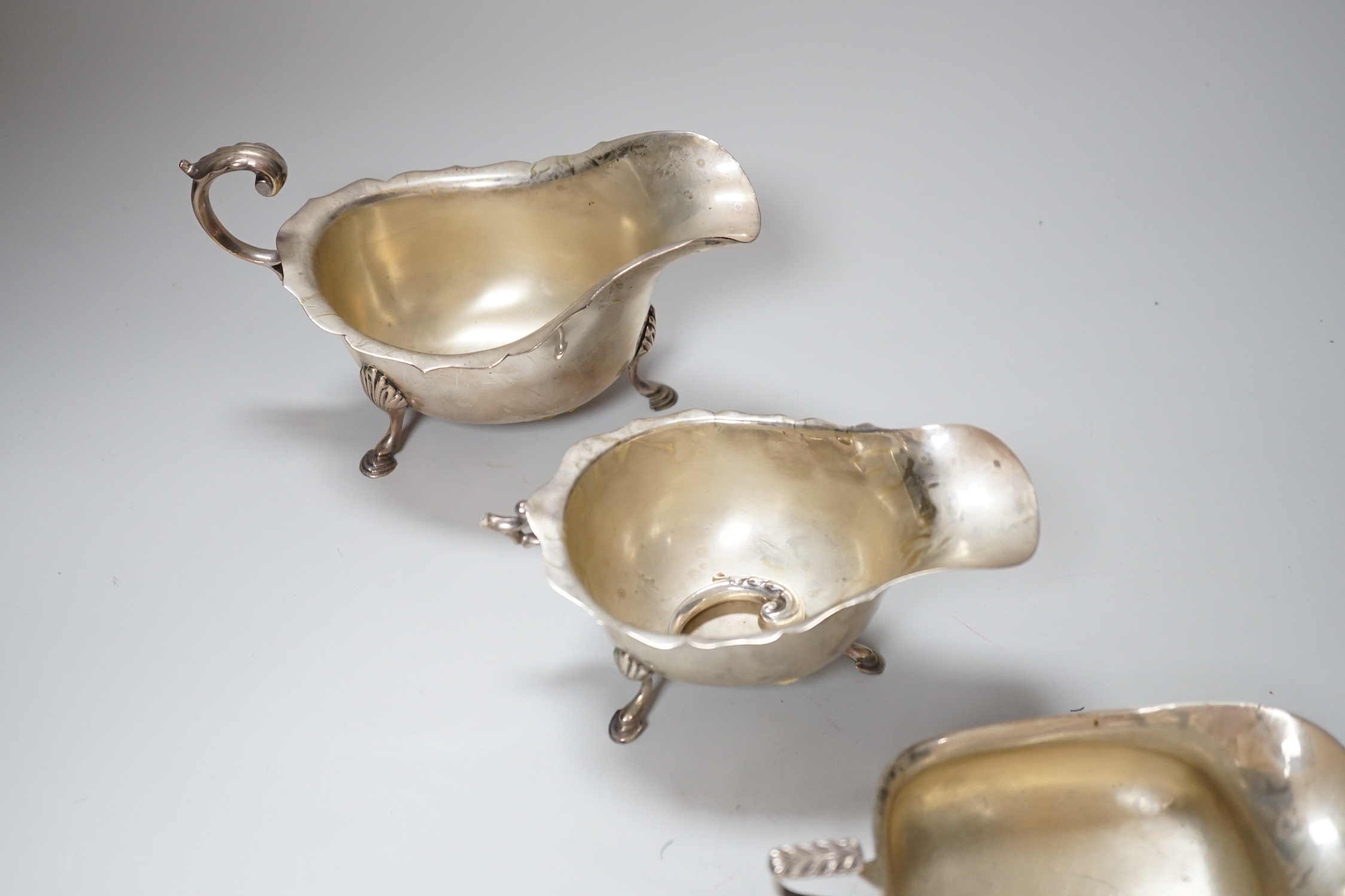 A George V silver sauceboat, Chester 1915, 189 grams, a later sauceboat with damaged handle, 82 grams and a shallow rectangular form sauceboat, 76 grams