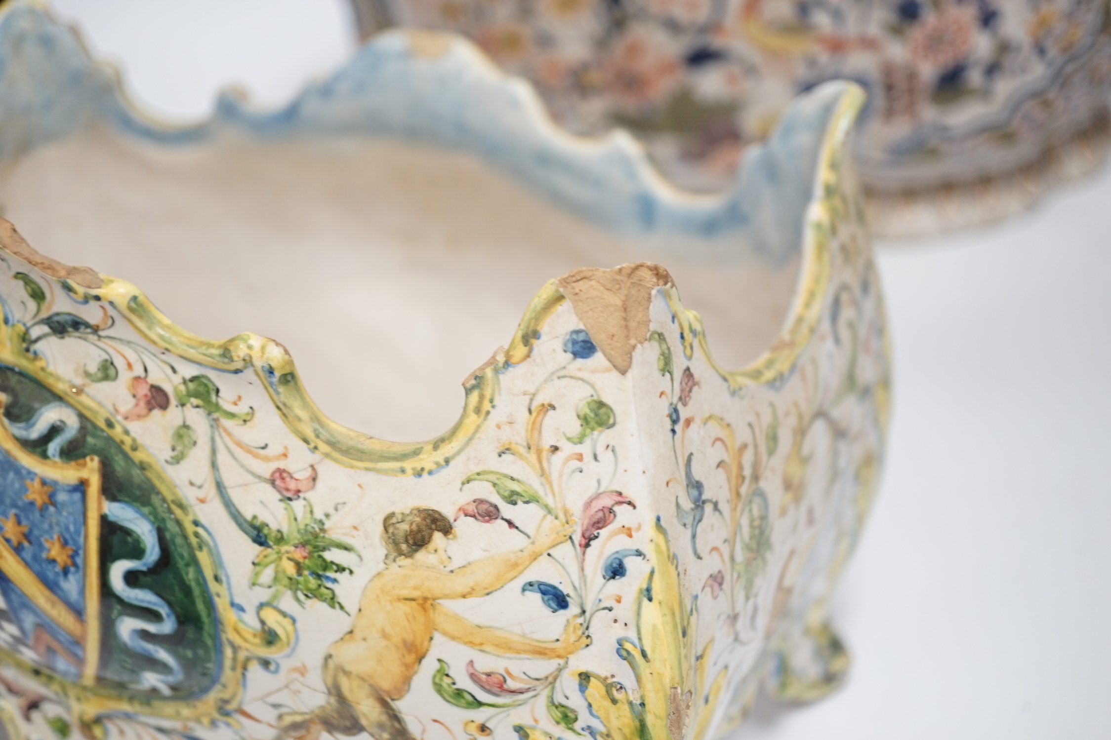 A Two French faience pottery planters, one with armorial crest and another, longer 34cm (2)
