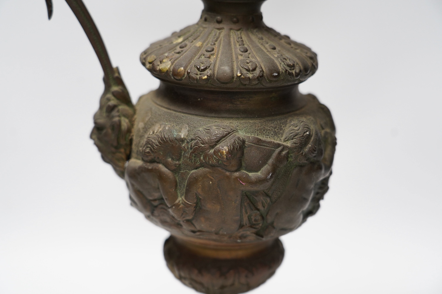 A Cellini style bronze ewer, possibly converted to a lamp later, decorated with putti panel and head handle, 42cm high. Condition - fair to good