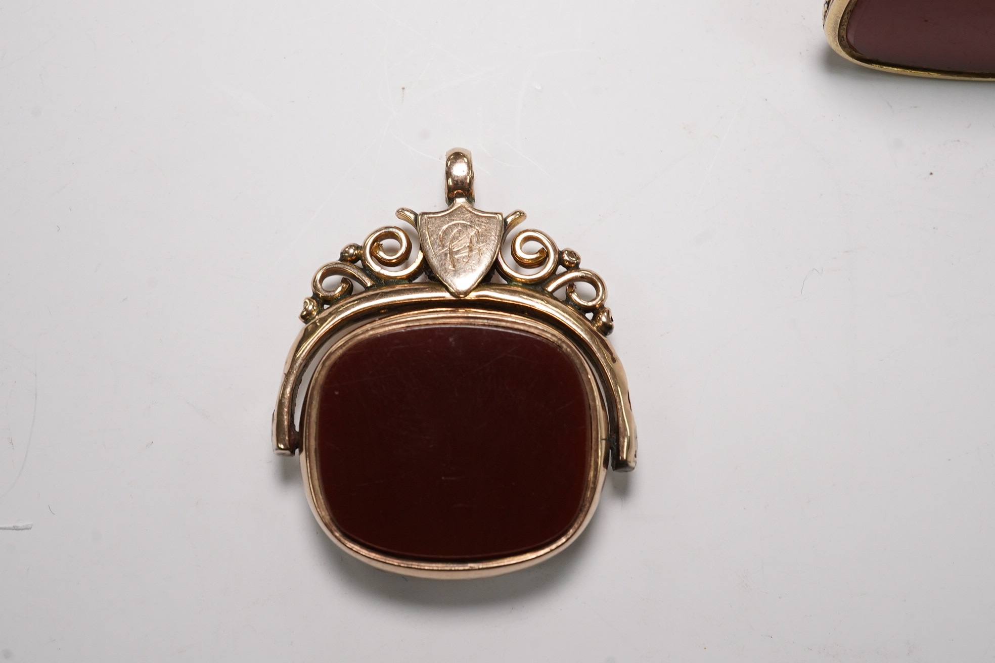 An early 20th century gold, carnelian and bloodstone set spinning fob, 34mm and one other gilt metal and carnelian set fob. Condition - poor to fair