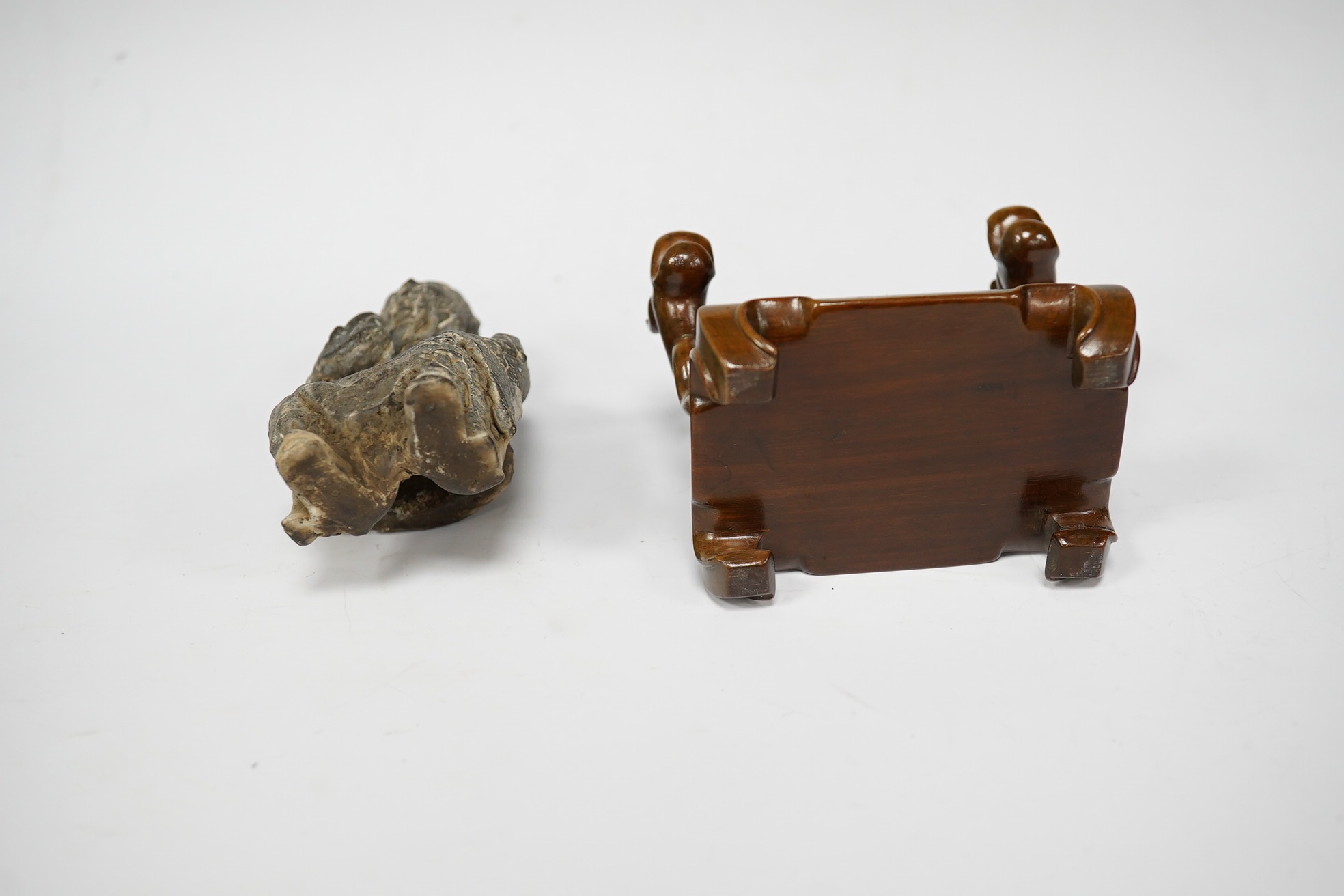 A Chinese grey pottery seated figure of a God, possibly Ming dynasty, seated on a later wood throne (with receipt of purchase from C C Tih Gallery, Hong Kong, 1968), 15cm high. Condition - fair