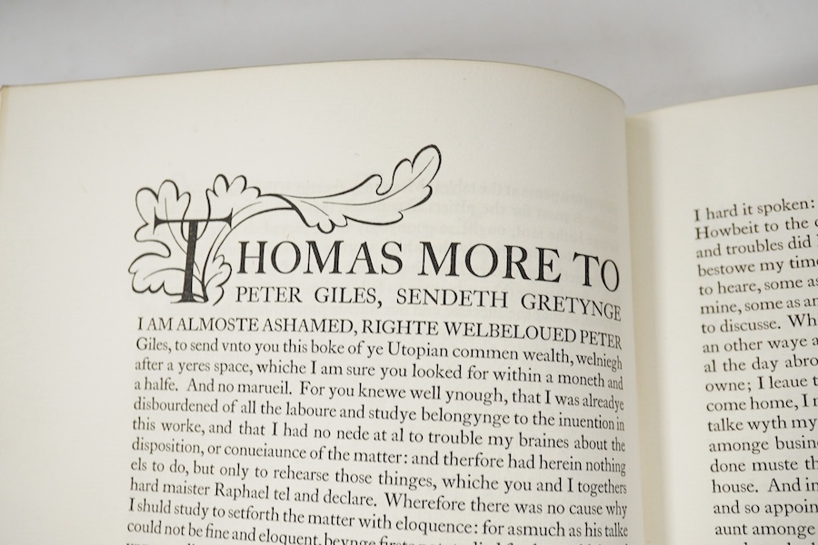 ° Golden Cockerel Press, Waltham Saint Lawrence, Berkshire - More, Thomas - Utopia, one of 500, floriated initials and title page by Eric Gill, 4to, green cloth gilt, spine and upper front board sunned, 1929, in solander case