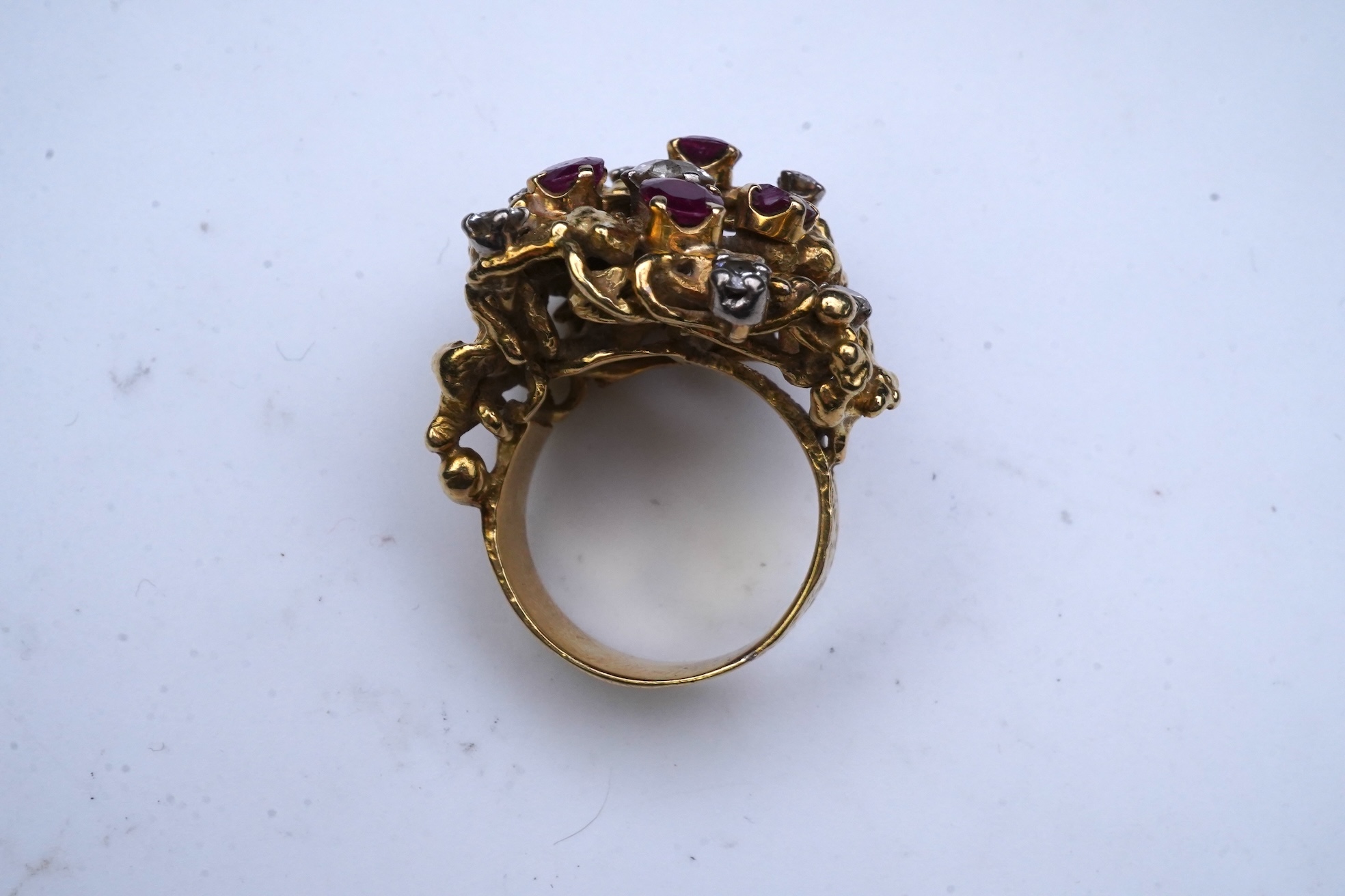 A ruby and diamond cocktail ring, 1970s, of abstract textured design, set with circular-cut diamonds and rubies, size M, gross weight 20 grams