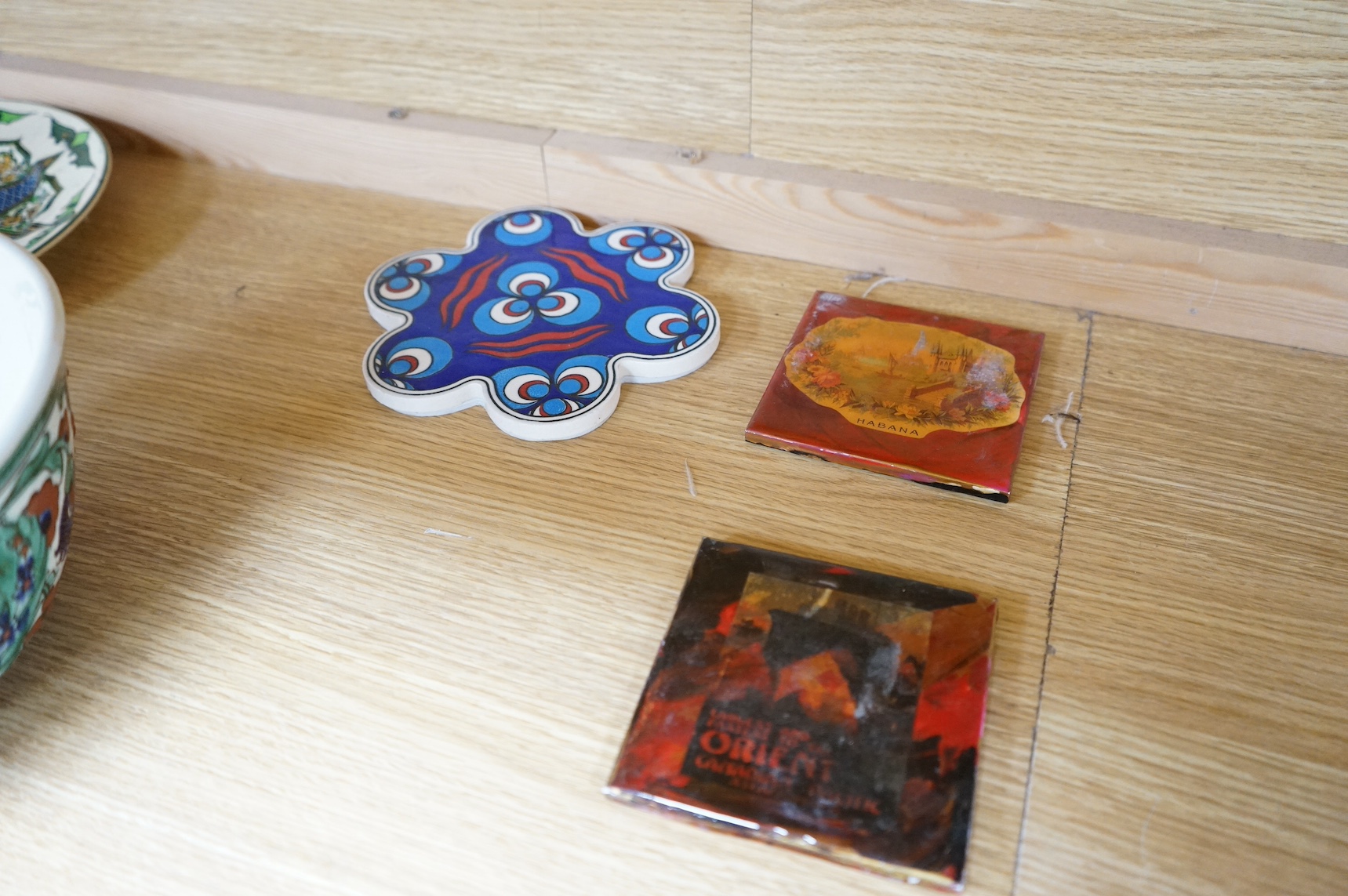 A collection of European tiles, to include a German rampant lion example, dishes and a Belgian bowl, largest 27cm in diameter. Condition - varies
