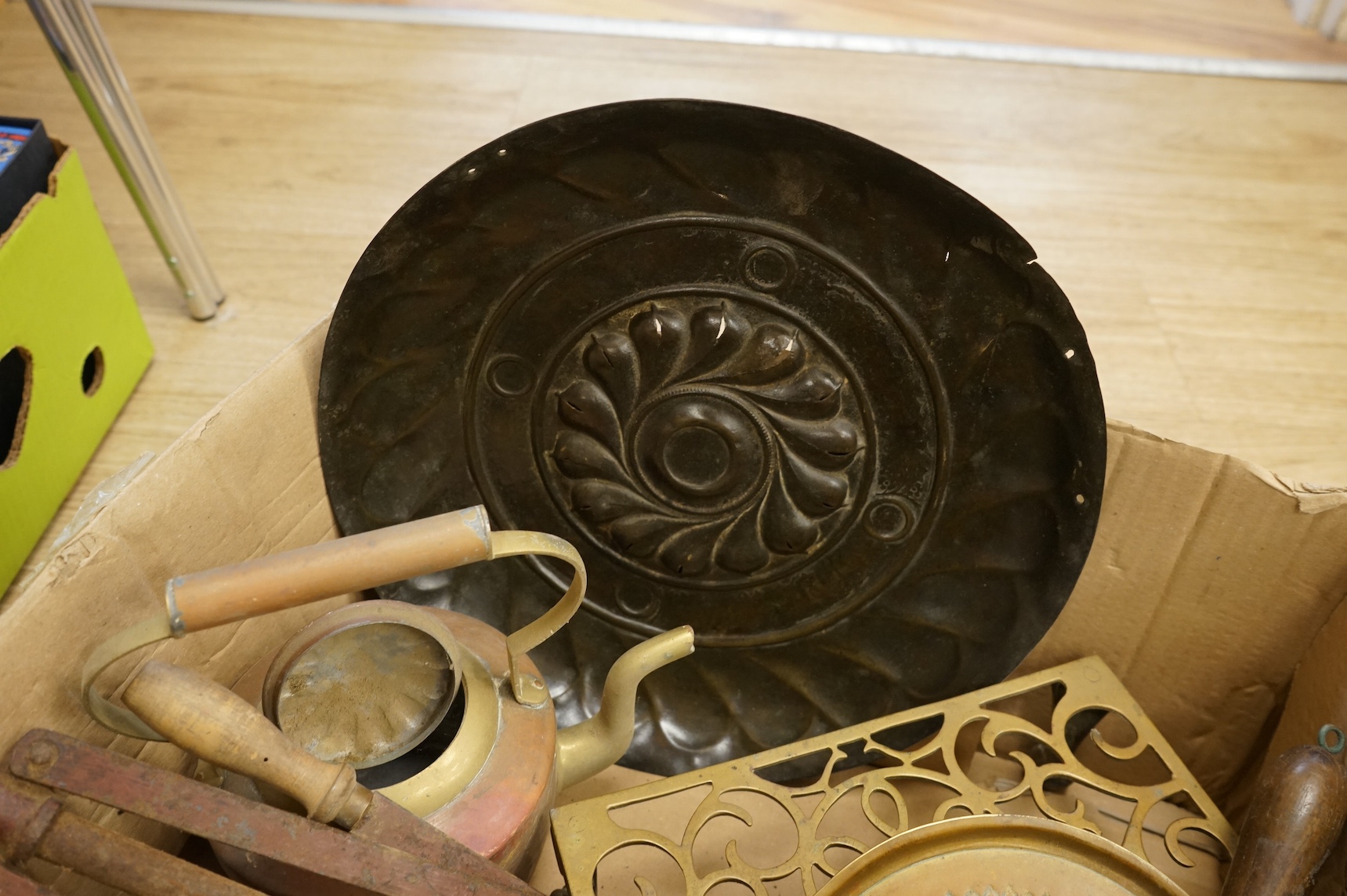A 17th century Nuremburg embossed brass alms dish, and other metalware, dish 34cm. Condition - worn