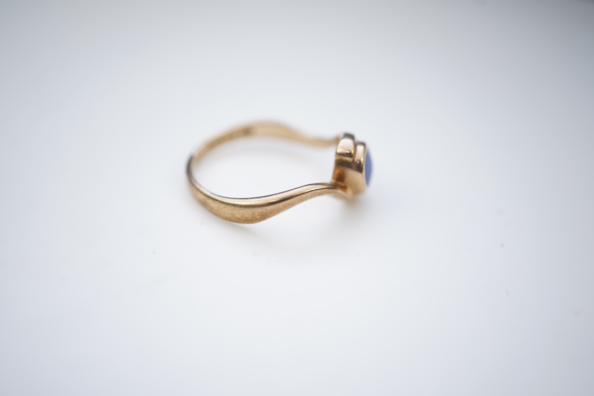 A gold and lapis lazuli demi-parure, comprising: a bracelet, composed of foliate links inlaid with polished lapis lazuli, mounted in 9ct gold, length 19.5cm, British hallmarks, gross weight 26 grams; and a ring of similar design in 9ct gold, size M1/2, British hallmarks, gross weight approximately 2.5 grams
