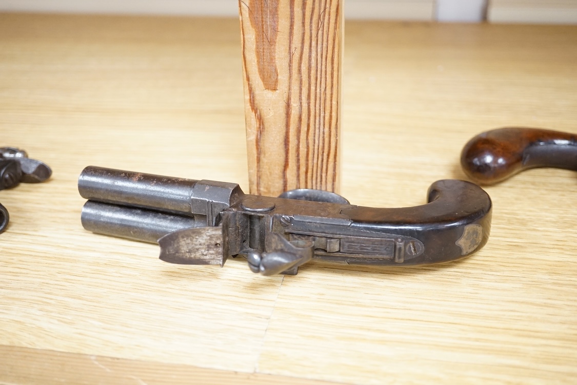 A double barrel flintlock, tap action pocket pistol by Collis of Oxford, with sliding top thumb safety, slab walnut grip, and tower private proof marks * Due to new safety regulations and legal restrictions with ParcelForce and Royal Mail, we are unable to pack and/or send swords, bladed items and weaponary through postal service.
