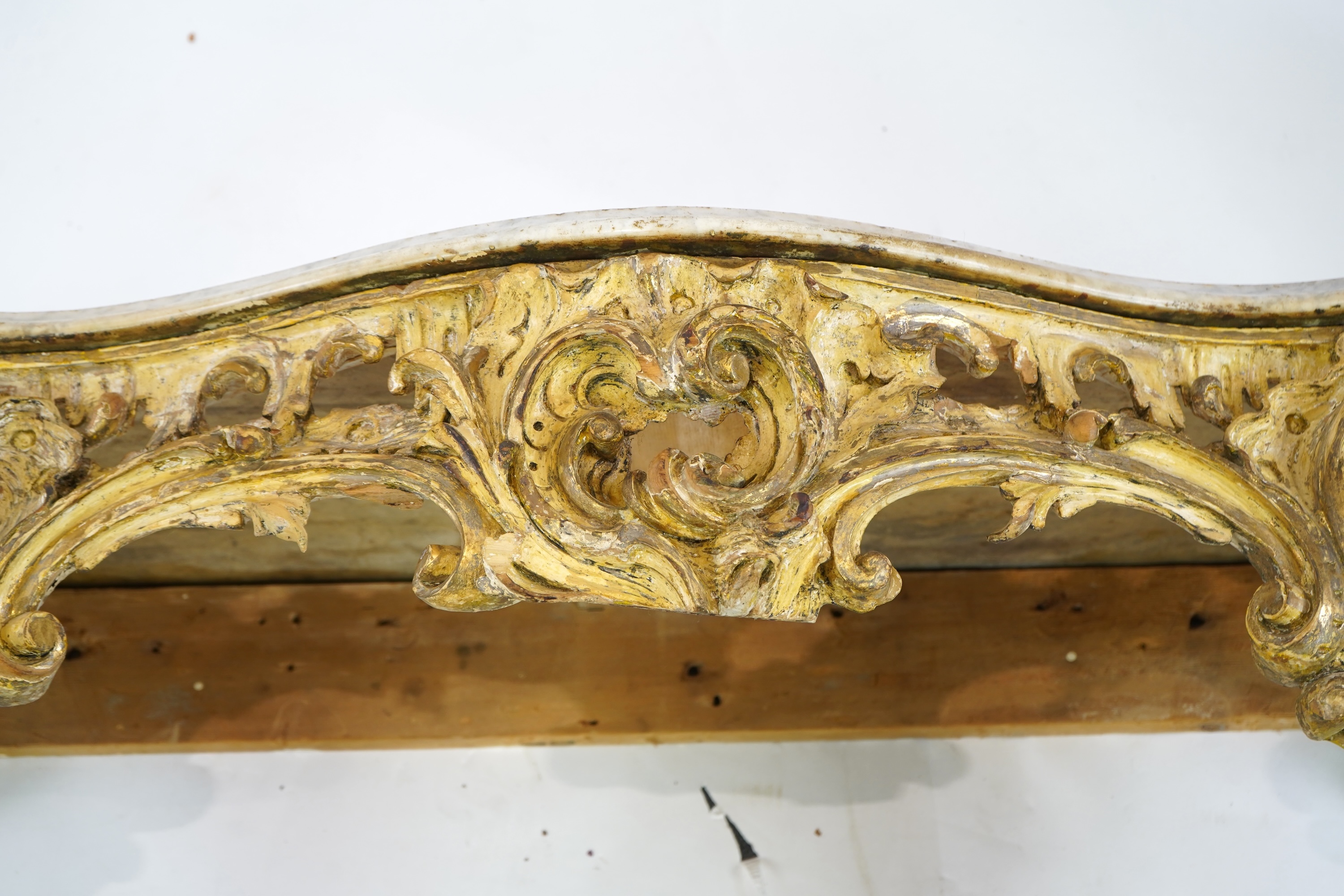 A 19th century Louis XIV style giltwood and composition serpentine console table with white marble top over a pierced floral and C scroll frieze on acanthus cabriole legs with uniting stretcher, 125cm wide, 52cm deep, 90cm high