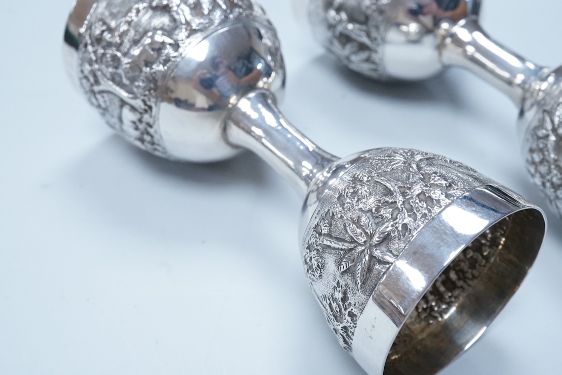 A pair of Indian embossed white metal single and double ended measures, 11.9cm, 5.2oz.