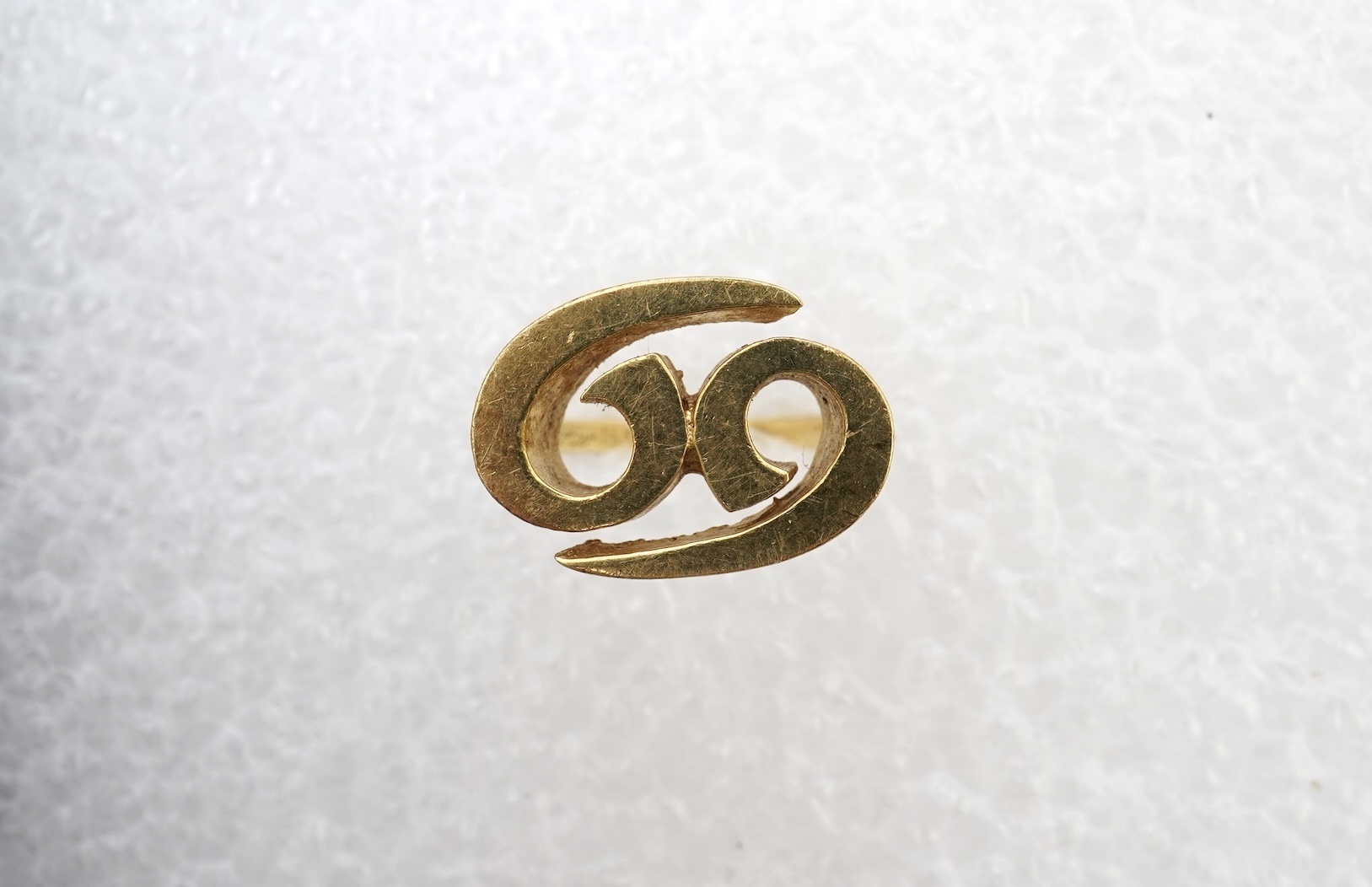 Cartier, a rare gold zodiac ring, 1970s, depicting the symbol for the star sign Cancer, mounted in gold, size G, signed Cartier, numbered 38225, gross weight approximately 6 grams