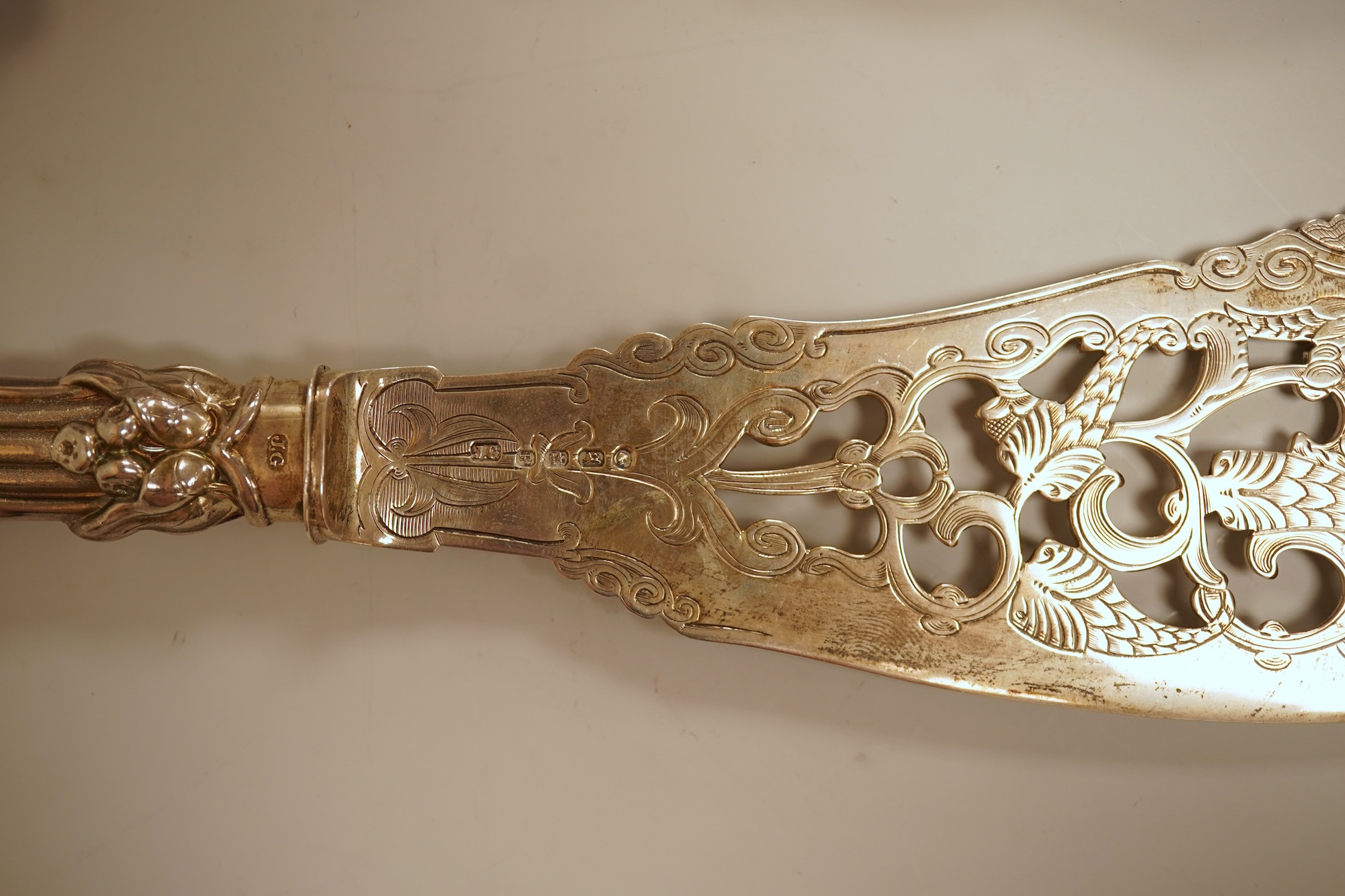 A pair of Victorian ornate silver fish servers, by John Gilbert, Birmingham, 1864, 34.1cm.