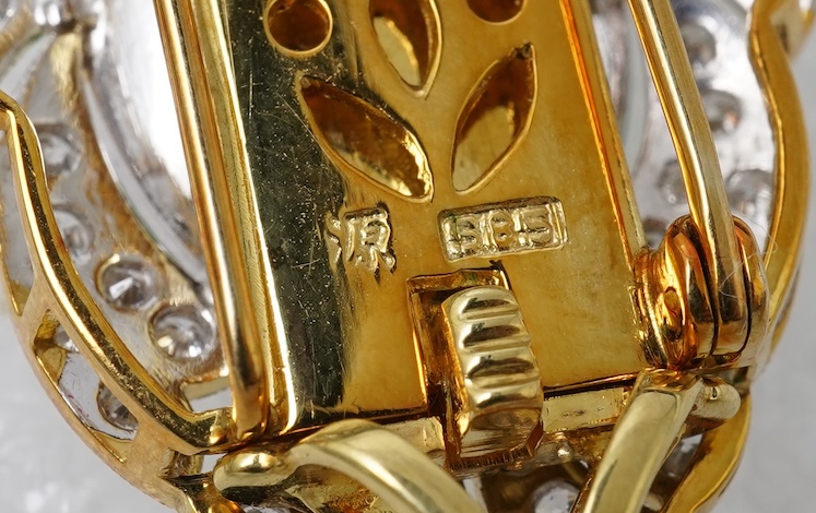 A jadeite and diamond brooch/pendant, centring on a cabochon jadeite measuring approximately 19.9 x 14.4mm, within a stylised foliate plaque mount set with brilliant-cut diamonds, totalling approximately 1.50-2.00 carats, mounted in gold, length 4cm, stamped 585, Chinese maker's mark RenLingJi, reverse with clasp fitting with removable pendant clip, gross weight approximately 14.5 grams.