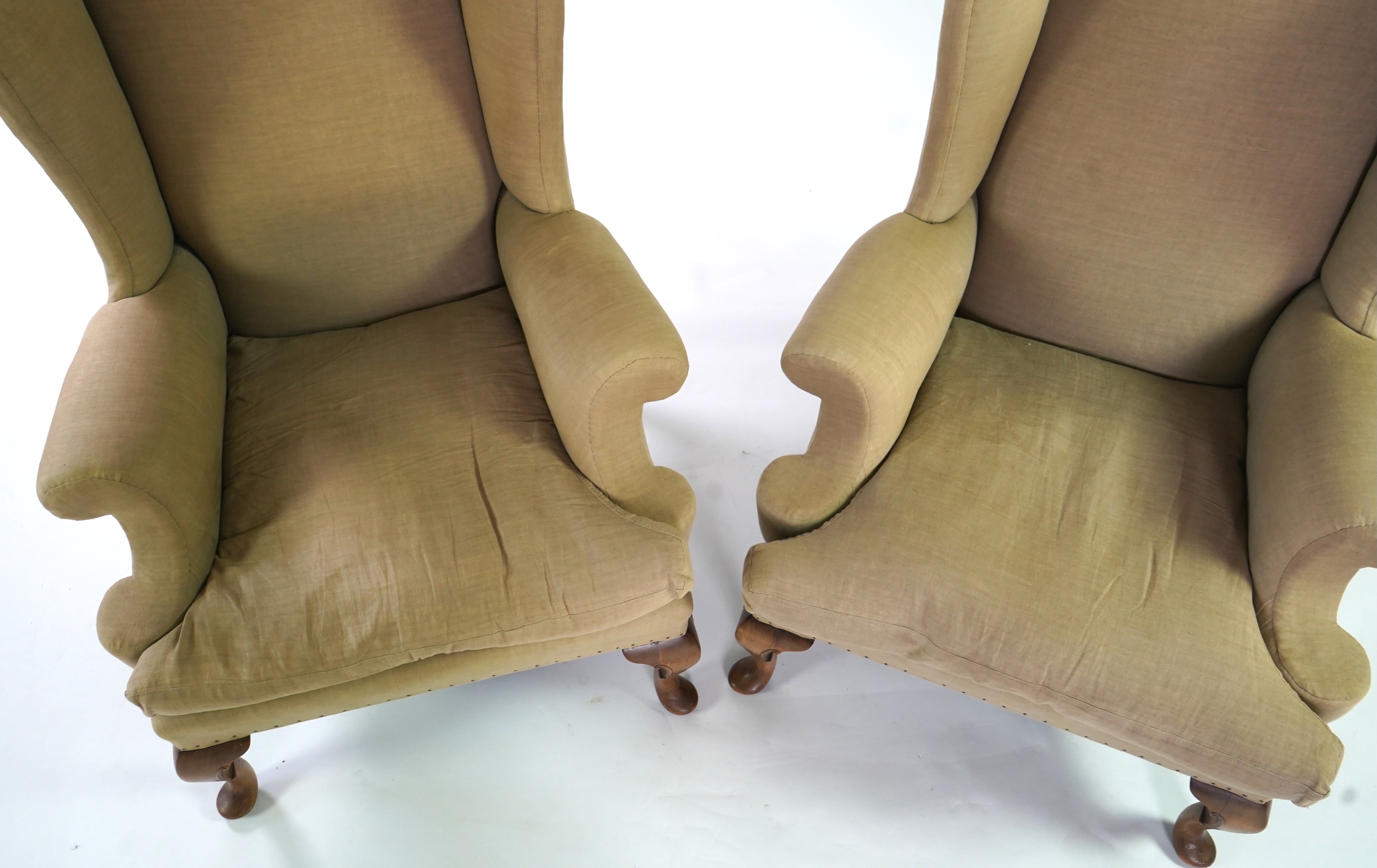 A pair of late 19th / early 20th century George II style upholstered wing armchairs with beige linen upholstery on carved walnut cabriole legs, 82cm wide, 74cm deep, 120cm high