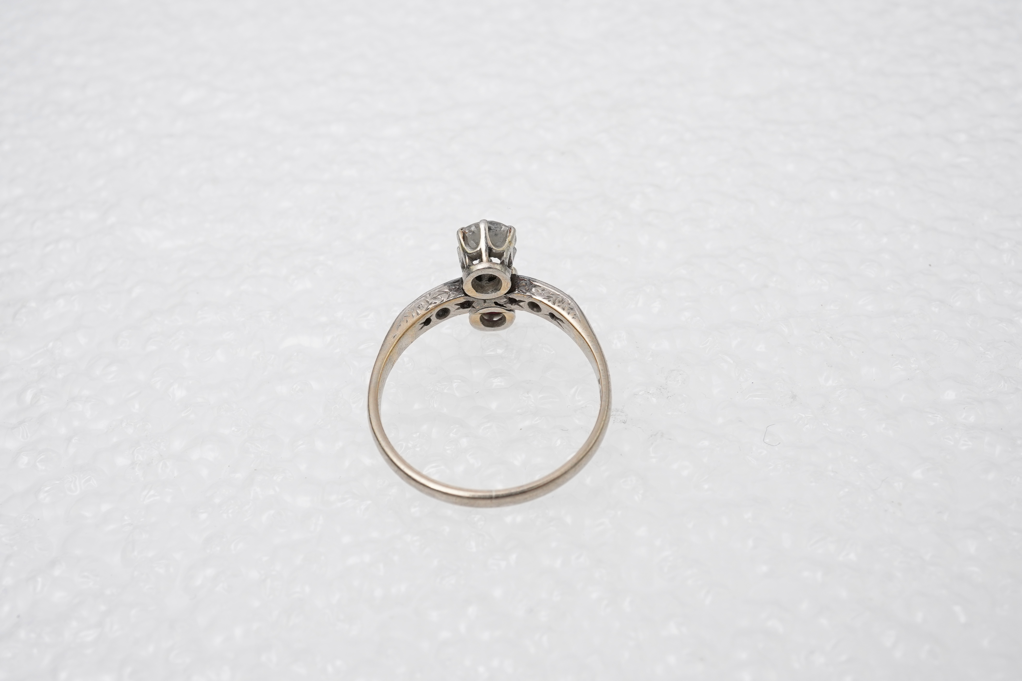 Diamond approximately SI2/I1 clarity, bright and lively, older circular cut. Synthetic ruby with minor wear. Band with evidence of solder, some associated dark discoloration. Overall a pretty design in wearable condition.