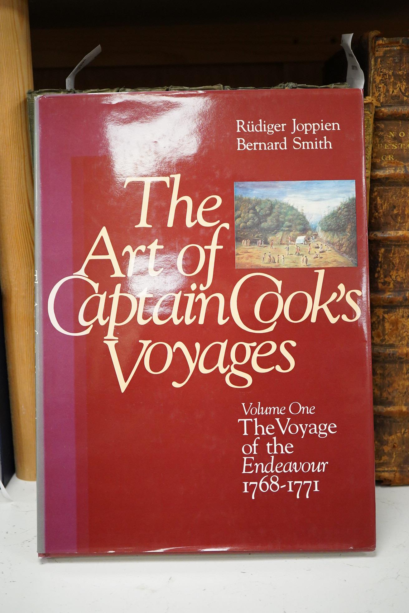 ° Joppien, Rudiger & Smith, Bernard - The Art of Captain Cook's Voyages ... 3 vols (in 4). illus. throughout (some full-page and coloured); publisher's cloth and d/wrappers, tall 4to. Yale University Press, 1985-88. *vol. 3 in two parts - text and catalogue