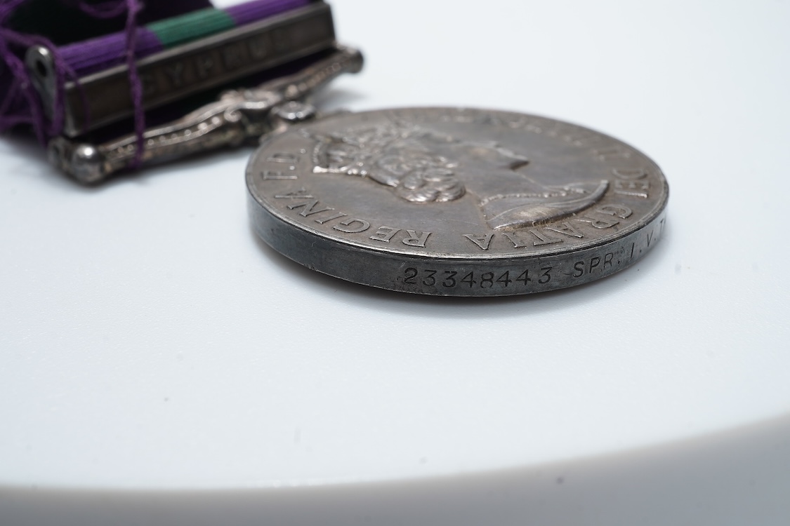 An Elizabeth II General Service medal with Cyprus Clasp awarded to 2334843 SPR I.V. Taylor R.E.