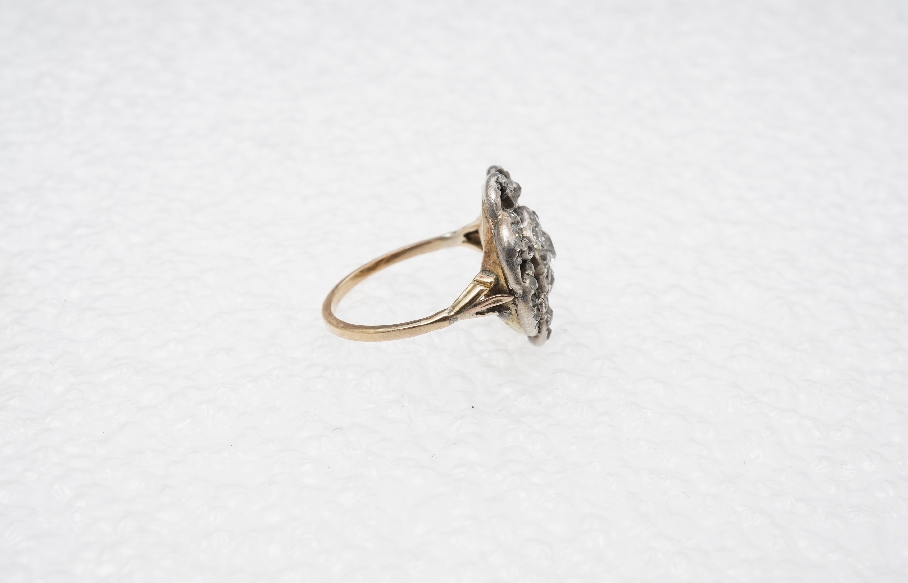 A diamond ring, early 19th century and later, centring on a cluster within a swirled border, set with circular-cut, cushion-shaped and rose-cut diamonds, in closed-back silver settings, to a later gold band, size L