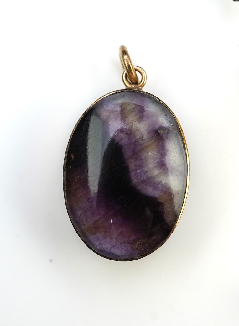 A collection of jewels, 19th/early 20th century, comprising: an 18ct gold MIZPAH ring, size Q, British hallmarks for 1883, approximately 4 grams; a Blue John and malachite pendant in 9ct gold, British hallmarks; an agate and malachite swivel fob seal/watch key pendant; an Edwardian amethyst and seed pearl bar brooch in gold, stamped 15C, gross weight approximately 2 grams; a plain wedding band in platinum, size I, gross weight approximately 2.5 grams; and a silver cross set with faceted rock crystals in closed settings, possibly Spanish or Portuguese, one rock crystal loose