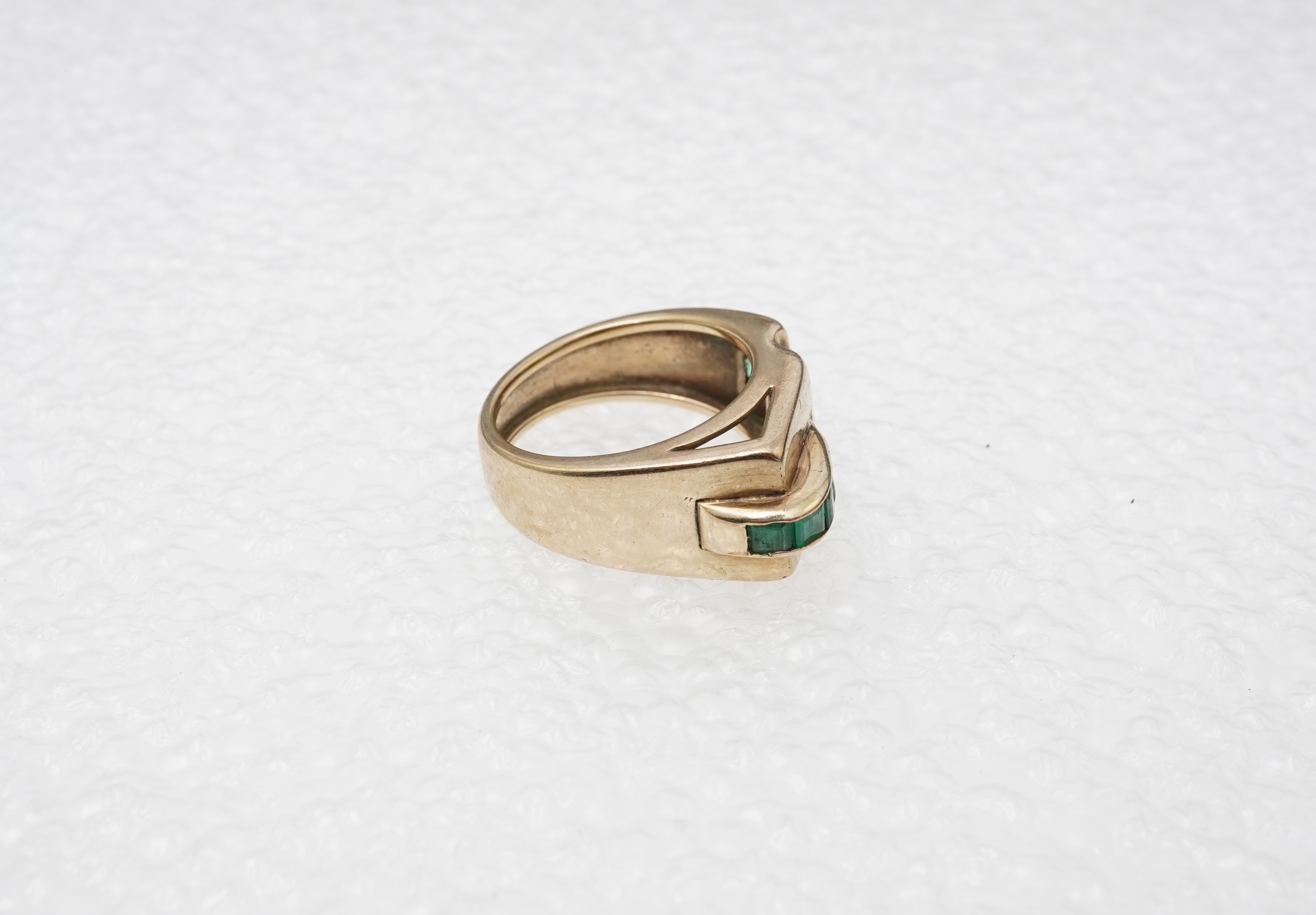 In good condition, minor wear to emeralds and metal.