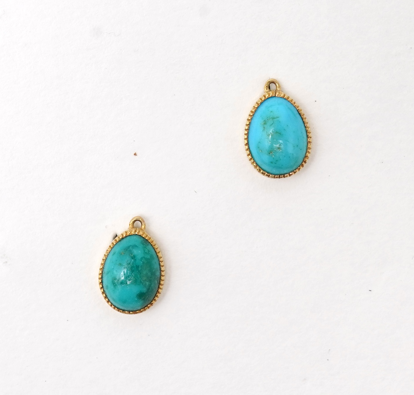 A collection of coral and turquoise jewels, comprising: a coral bead necklace, beads approximately 6-7mm, to a gold spherical clasp, necklace length 102cm, clasp stamped 375, gross weight approximately 61 grams; a pair of earrings of knotted design, set with coral cabochons, length 3.4cm each, hook fittings; and a pair of quatrefoil turquoise and rose-cut diamond earrings, length 1.3cm each, screw fittings, together with a pair of detached pear-shaped cabochon turquoise drops