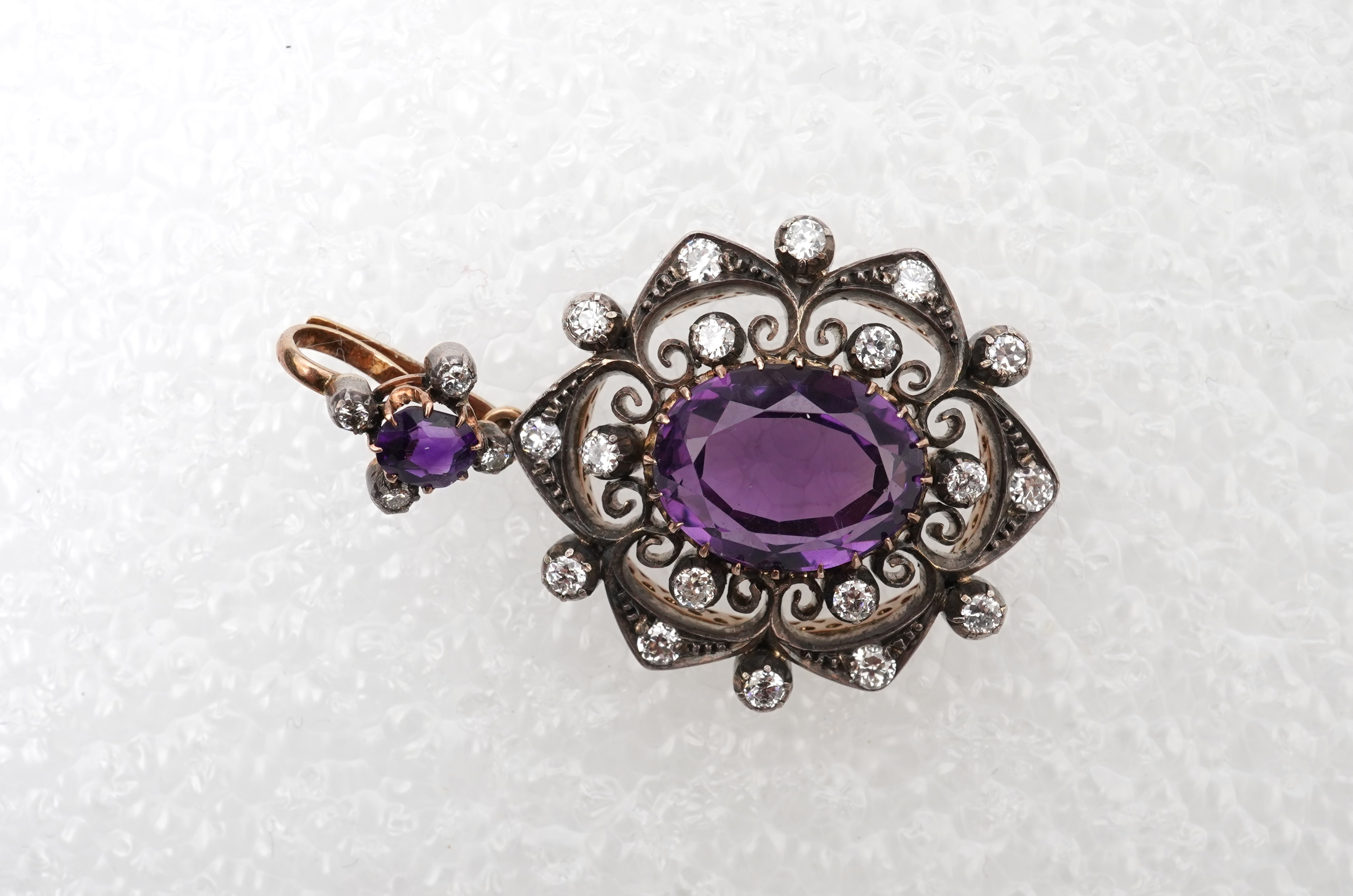 A Victorian amethyst and diamond pendant, late 19th century, claw-set with an oval amethyst, within a foliate openwork frame set with circular-cut diamonds totalling approximately 1.00 carat, to a similar detachable bail, mounted in silver and gold, length 4.2cm