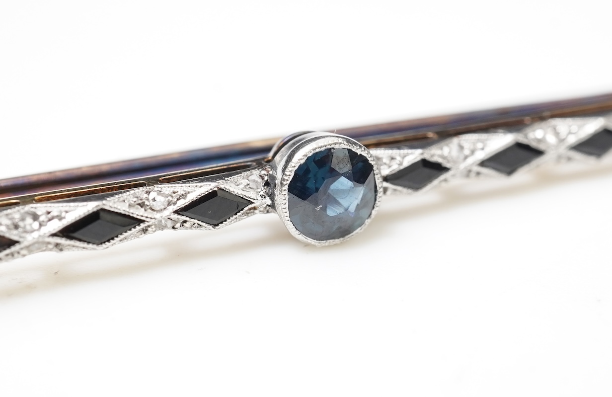 A sapphire bar brooch and an enamel and diamond pendant, early 20th century, the pendant centring on a pear-shaped panel of green guilloché enamel within a border of rose-cut diamonds, suspended from a rose-cut diamond surmount, mounted in silver and gold, length 1.8cm; the bar brooch set to the centre with a circular-cut sapphire, flanked by geometric sequences of calibré-cut onyx and rose-cut diamonds, mounted in gold and platinum, length 5.5cm, combined gross weight 5 grams